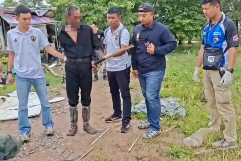 โดยจุดแรก ผู้ต้องหาชี้ไปที่ไม้ไผ่ยาวประมาณ 1 เมตร ด้ามพันด้วยยางรถยนต์เก่า อ้างว่าเป็นอาวุธที่ใช้ฟาดผู้ตาย ส่วนจุดที่สอง เป็นจุดที่ผู้ต้องหาเปลี่ยนเสื้อผ้าที่เปื้อนเลือด ภายในบ้านยังพบมีดอีก 3–4 ด้าม ซึ่งเจ้าหน้าที่พิสูจน์หลักฐานได้เก็บไปตรวจสอบเพิ่มเติม สำหรับแรงจูงใจ ผู้ต้องหาอ้างว่าในขณะกำลังตัดฟืน ผู้ตายเปิดกระแสไฟลงลวดที่ใช้กั้นฝูงควาย ทำให้ตนถูกไฟช็อตตกจากต้นไม้ จึงเข้าไปถาม แต่ถูกผู้ตายใช้ไม้ตีเข้ามาก่อน จึงเกิดการตอบโต้ ใช้ไม้ฟาดและเตะผู้ตายหลายครั้ง โดยปฏิเสธว่าไม่ได้ใช้มีดแทง แต่ผู้ตายอาจล้มทับมีดเอง ขณะหลบหนีผู้ต้องหาได้นำกระเป๋าเป้ติดตัวไปด้วย ภายในกระเป๋าพบมีดทำครัวปลายแหลมยาวประมาณ 30 เซนติเมตร เบื้องต้น ผู้ต้องหาได้กล่าวขอโทษต่อญาติผู้เสียชีวิต อ้างไม่คิดว่าเรื่องจะบานปลายจนกลายเป็นเหตุสลดในครั้งนี้ ทางเจ้าหน้าที่่ควบคุมตัวไปดำเนินคดีตามกฎหมายต่อไป