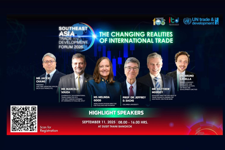 ITD Southeast Asia Trade and Development Forum 2025 จึงไม่ใช่เพียงเวทีแลกเปลี่ยนความรู้ แต่ยังเป็นจุดเริ่มต้นของการออกแบบอนาคตเศรษฐกิจไทยและอาเซียนร่วมกัน ผู้สนใจสามารถลงทะเบียนเข้าร่วมงานได้ฟรีที่ itd.or.th เพื่อร่วมเป็นส่วนหนึ่งของการกำหนดทิศทางการค้าโลกครั้งสำคัญ