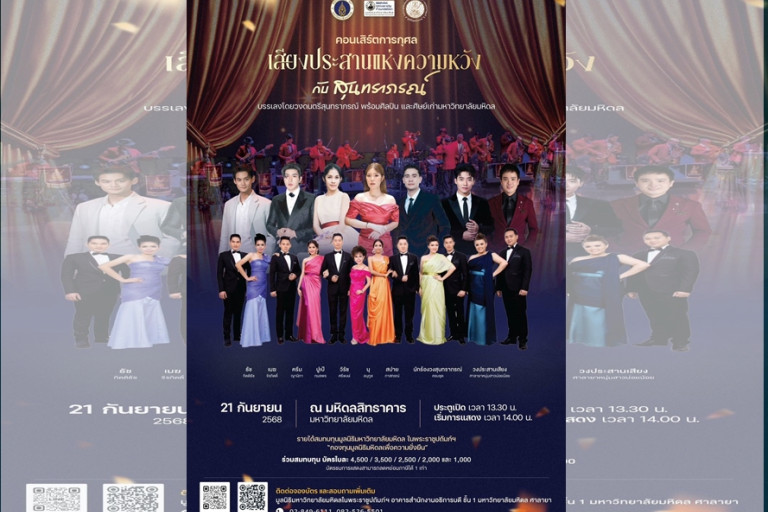 มูลนิธิมหาวิทยาลัยมหิดล ในพระราชูปถัมภ์สมเด็จพระเทพรัตนราชสุดาฯ สยามบรมราชกุมารี ร่วมกับ มหาวิทยาลัยมหิดล ขอเชิญร่วมงานคอนเสิร์ตการกุศล “เสียงประสานแห่งความหวัง กับ สุนทราภรณ์” วันอาทิตย์ที่ 21 กันยายน 2568 ณ มหิดลสิทธาคาร มหาวิทยาลัยมหิดล ศาลายา เวลา 13.30 น. เป็นต้นไป เพื่อระดมทุนการสร้าง “MU-Bio Plant” โรงงานยาที่มีชีวิต แห่งแรกในประเทศไทย เพื่อยกระดับการรักษาโรคร้ายแรง รองรับการรักษาแบบเซลล์บำบัดและยีนบำบัดในประเทศไทย ทำให้คนไทยเข้าถึงการรักษาโรคมะเร็งและโรคร้ายแรงอื่น ๆ ได้ในราคาที่เหมาะสม ผลักดันไทยสู่ศูนย์กลางด้านเซลล์บำบัดและยีนบำบัด (Cell and Gene Therapy) ระดับอาเซียน และยกระดับมาตรฐานทางการแพทย์ไทยให้ทัดเทียมนานาชาติ