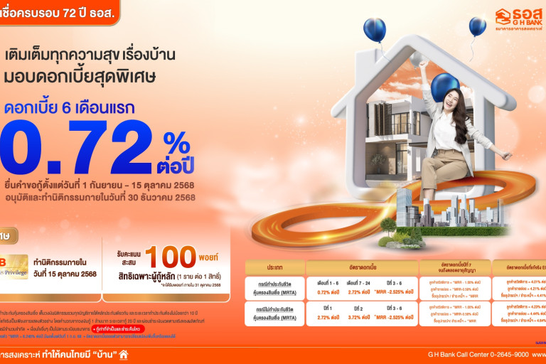 ธนาคารอาคารสงเคราะห์ (ธอส.) ตอบแทนลูกค้าในโอกาสครบ 6 รอบ 72 ปี จัดแคมเปญด้วยการมอบโปรโมชันสินเชื่อบ้านอัตราดอกเบี้ยต่ำพิเศษนานถึง 6 ปี กรอบวงเงินรวม 27,000 ล้านบาท กับ “สินเชื่อบ้าน 72 ปี ธอส.”