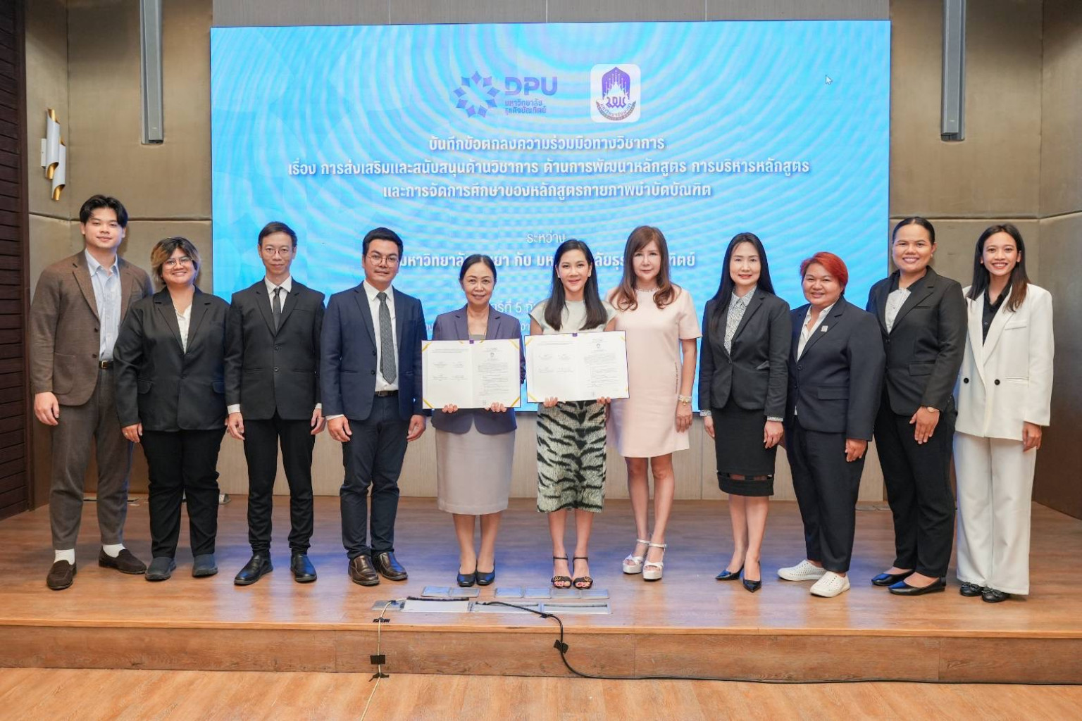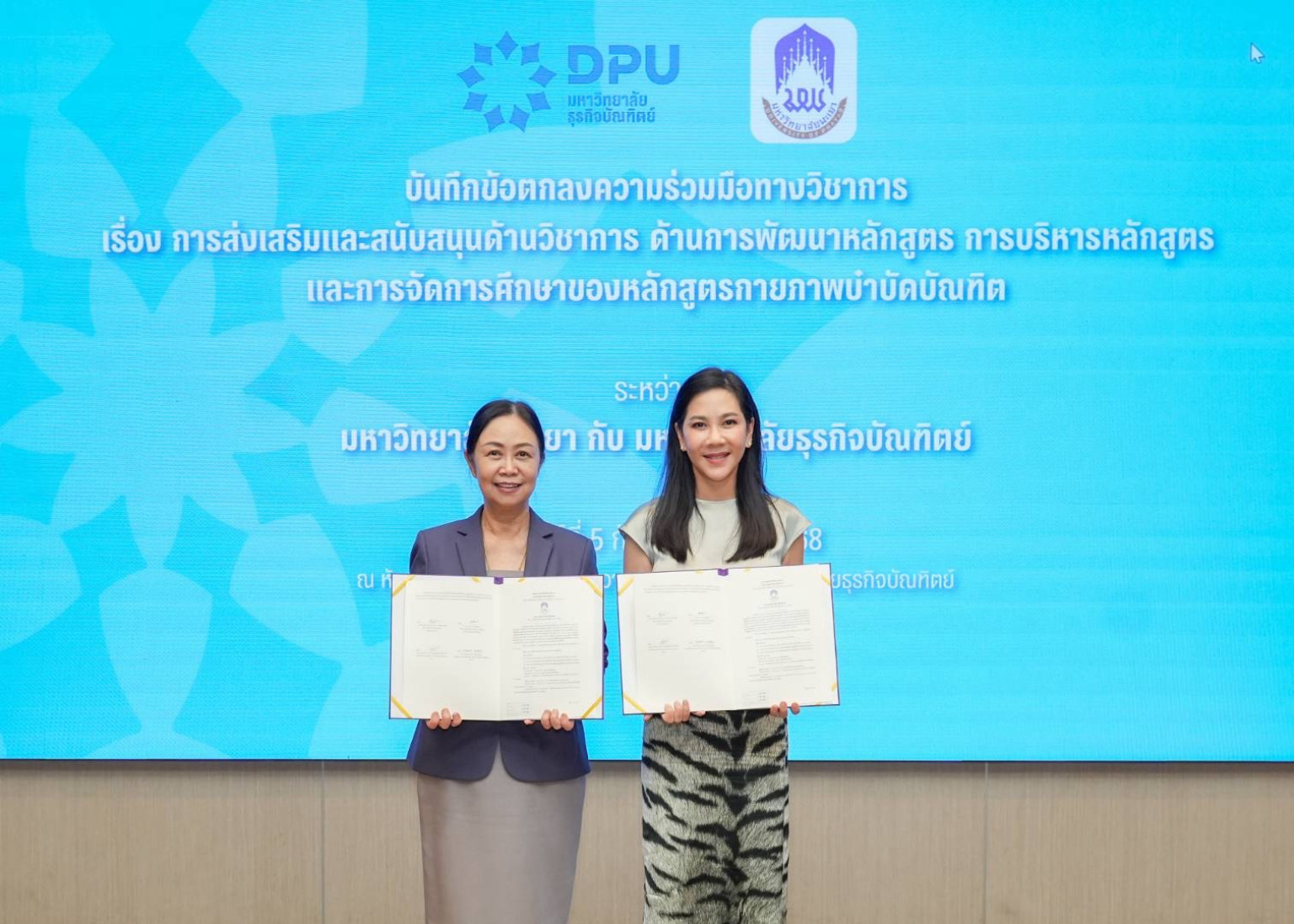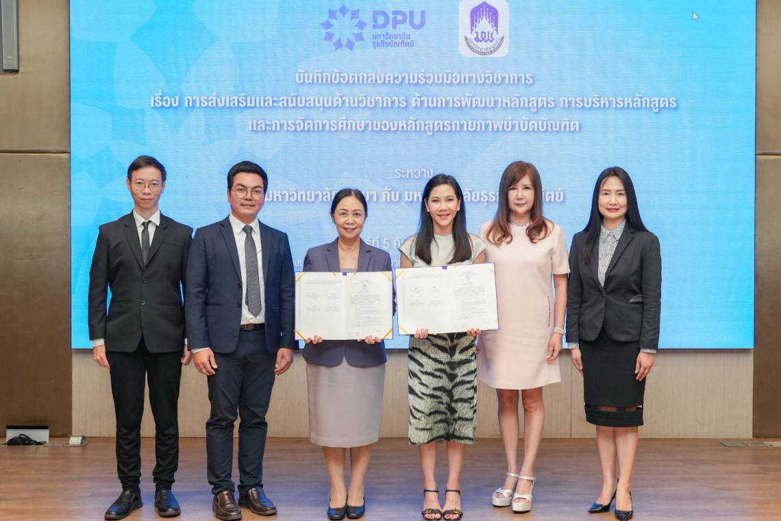 วันศุกร์ที่ 5 กันยายน พ.ศ. 2568 มหาวิทยาลัยธุรกิจบัณฑิตย์ (DPU) และ มหาวิทยาลัยพะเยา ได้ร่วมกันจัดพิธีลงนามบันทึกข้อตกลงความร่วมมือทางวิชาการ เพื่อแลกเปลี่ยนองค์ความรู้ การสนับสนุนด้านหลักสูตร และการจัดการเรียนการสอน เพื่อยกระดับคุณภาพทางวิชาการให้เป็นไปตามมาตรฐานของสภากายภาพบำบัด ณ ห้องประชุมสัจจา เกตุทัต1 อาคารอธิการบดี มหาวิทยาลัยธุรกิจบัณฑิตย์