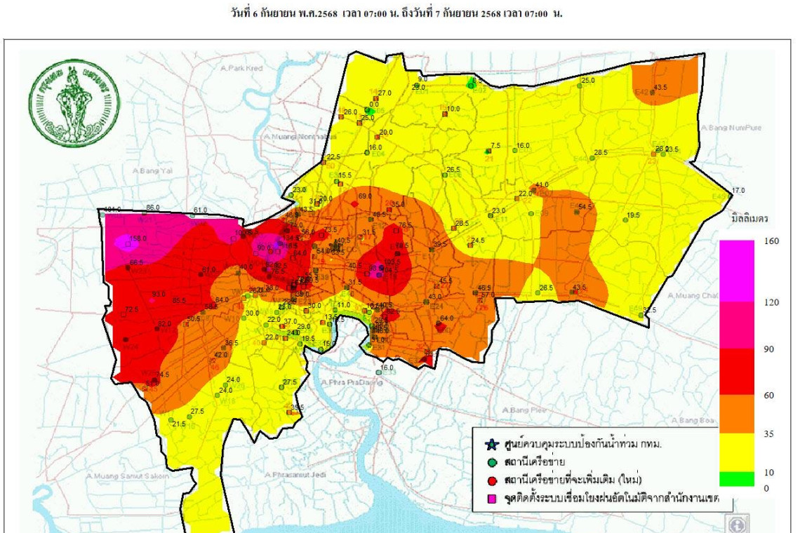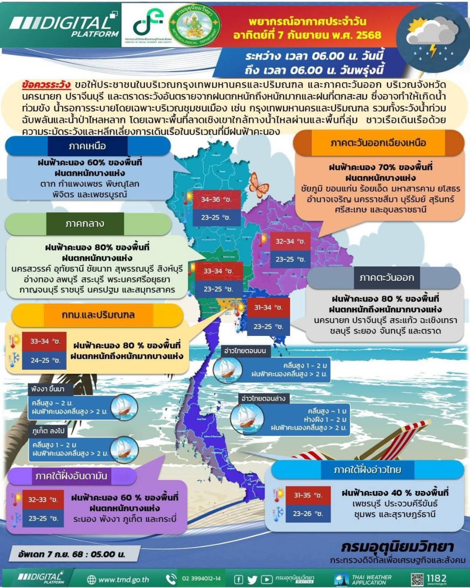 สำนักการระบายน้ำ กรุงเทพมหานคร (กทม.) รายงานสถานการณ์ประจำวันที่ 7 กันยายน 2568 ลักษณะอากาศทั่วไป พยากรณ์อากาศ 24 ชั่วโมงข้างหน้า โดยเตือนประชาชนในพื้นที่กรุงเทพฯ และปริมณฑล ให้เตรียมพร้อมรับมือฝนฟ้าคะนองร้อยละ 80 ของพื้นที่ และมีฝนตกหนักถึงหนักมากบางแห่ง โดยคาดการณ์อุณหภูมิต่ำสุด 24-25 องศาเซลเซียส และสูงสุด 33-34 องศาเซลเซียส เนื่องจากร่องมรสุมกำลังแรงพาดผ่านภาคกลาง ประกอบกับมรสุมตะวันตกเฉียงใต้ยังคงพัดปกคลุมทะเลอันดามันและอ่าวไทยอย่างต่อเนื่อง