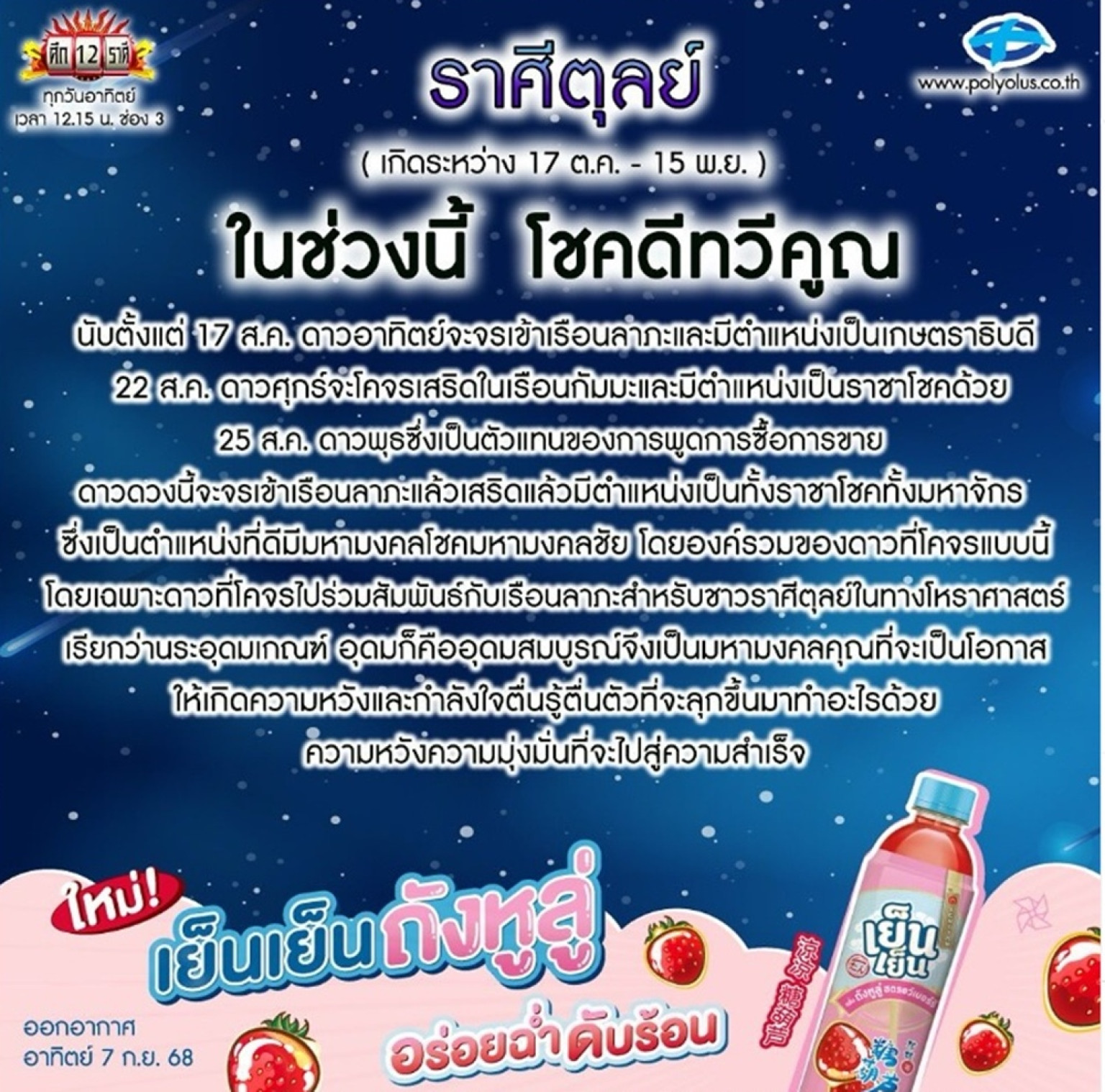 7 กันยายน 2568 13:52 น. สยามรัฐออนไลน์ เช็กดวง วันที่ 7 ก.ย.68 "ลักษณ์ ราชสีห์" หรือ "หมอลักษณ์ ฟันธง" นักพยากรณ์ชื่อดัง ทำนายดวงผ่านอินสตาแกรม @polyplus_jad_hai ระบุว่า #ราศีตุลย์ ในช่วงนี้ โชคดีทวีคูณ ขอบคุณ IG-@polyplus_jad_hai