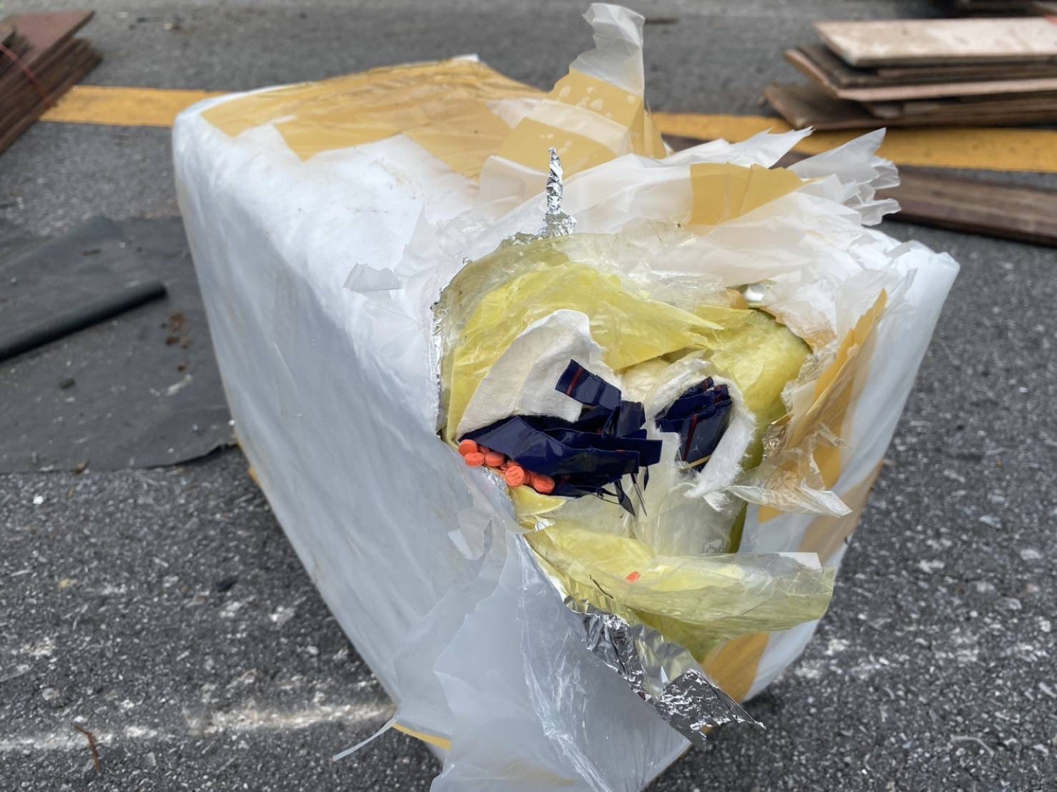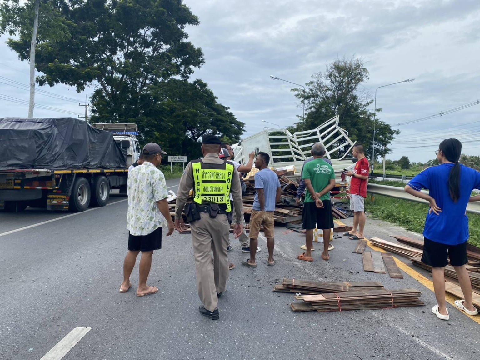 เจ้าหน้าที่ตำรวจ สภ.สามกระทาย ร่วมกับตำรวจทางหลวงประจวบคีรีขันธ์ และหน่วยกู้ภัยตำรวตทางหลวงประจวบคีรีขันธ์จุดกุยบุรี เข้าตรวจสอบ พบรถบรรทุกอีซูซุ สีขาว ทะเบียนกรุงเทพฯ สภาพยางแตกก่อนพุ่งชนการ์ดเรลจนพลิกตะแคง ภายในรถว่างเปล่าไม่พบคนขับ หรือผู้บาดเจ็บรายใดอยู่ภายในที่เกิดเหตุ ส่วนบนถนนมีแผ่นไม้และลังโฟมจำนวน 54 ลังตกกระจัดกระจาย กีดขวางการจราจรไปหนึ่งช่องทาง โดยพบว่าหนึ่งในลังโฟมที่ตกบนถนนแตกเสียหาย จนพบว่ามีห่อยาบ้าซุกซ่อนอยู่ภายใน