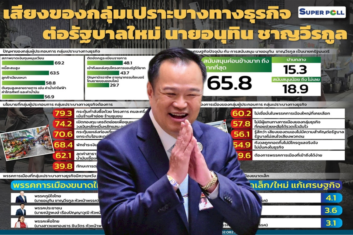 รายงานของซูเปอร์โพล ระบุว่า ภาพรวมตัวเลขทั้งสี่มิติปัญหาเชิงโครงสร้าง, การสนับสนุนผู้นำ, นโยบาย ที่ต้องการ, และความหวังต่อพรรคสอดประสานกันอย่างมีเหตุผล นัยสำคัญคือฐานราก “ต้องการของจริง” ที่อธิบายได้ด้วยตรรกะทางเศรษฐกิจรายย่อย ลดต้นทุนคงที่และผันแปร, เติมสภาพคล่องต้นน้ำ, และขยายช่องทางขายปลายน้ำผ่านตลาดชุมชนและดิจิทัล ผลที่พบว่ากลุ่มตัวอย่าง “สนับสนุนนายอนุทิน” ในระดับสูง (65.8%) เข้ากันได้กับการจัดอันดับ “ภูมิใจไทย” ในฐานะพรรคที่ประชาชนหวังพึ่งแก้เศรษฐกิจ (38.9%) ขณะเดียวกัน ระดับ “ไม่เชื่อมั่นพรรคใหญ่ที่เคยเลือก” (60.2%) และ “ต้องการพรรคที่เข้าถึงง่าย” (49.6%) เปิดพื้นที่ให้ “พรรคเล็ก/ใหม่” โดยเฉพาะพรรคที่แสดงบทบาทจับต้องได้กับผู้ค้ารายย่อยเติบโตเป็น “ตัวเลือกสำรอง” ที่ทรงศักยภาพในรอบปีข้างหน้า ในเชิงการสื่อสารนโยบาย ผลสำรวจยืนยันกรอบ “เงินลงชุมชนเร็ว-ต้นทุนลดไว-ตลาดเพิ่มทันที” ผ่าน 3 คันโยก ได้แก่ (1) คนละครึ่ง เวอร์ชันร้านเล็กและตลาดชุมชน (เห็นด้วย 79.3%), (2) เครดิตย่อยดอกเบี้ยต่ำ และ/หรือ “พักเงินต้นแบบคัดกรอง” (74.2%/68.4%), และ (3) ท่องเที่ยวชุมชน ยกระดับโฮมสเตย์(70.6%) โดยมี ไฟฟ้า น้ำ โทรฯ เชื้อเพลิง เป็นเสาหลักของการลดต้นทุน (62.1%) หากรัฐบาลใหม่เร่งกลไกเหล่านี้ “ถึงมือ” ผู้ประกอบการอย่างรวดเร็ว ความไว้วางใจย่อมยกระดับต่อเนื่องด้วยหลักฐานจากหน้างาน