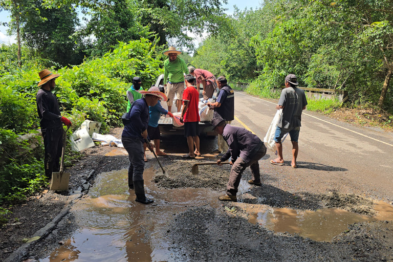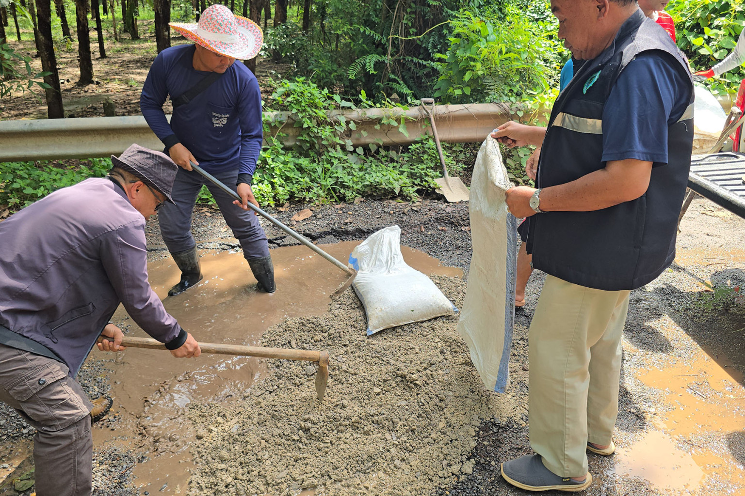 วันที่ 8 กันยายน 2568 ผู้สื่อข่าวได้ลงพื้นที่หลังจากได้รับแจ้งจากชาวบ้าน บ้านชมภูพร ต.นาทับไฮ อ.รัตนวาปี จ.หนองคาย ได้ร่วมใจกันกว่า 10 คน นำจอบ เสียม เข้าซ่อมแซมถนนเชื่อมต่อระหว่าง บ้านชมภูพร ต.นาทับไฮ- บ้านท่าคำบง ต.วังหลวง โดยเฉพาะช่วงคอสะพานห้วยนาแพง มีหลุมลึกมานานแรมปี มีอุบัติเหตุเกิดขึ้นบ่อยครั้ง ไม่มีหน่วยงานใดเข้ามาแก้ไข ทำให้การสัญจรลำบาก ประชาชนเดือดร้อน จึงรวมตัวกันนำนำอุปกรณ์ดังกล่าว มาเพื่อนำหิน ทราย ตามข้างถนนที่พอหาได้ มากลบหลุม นายณัฐพงษ์ แสนวัง นายกองค์การบริหารส่วนตำบลนาทับไฮ เมื่อทราบเรื่องจึงได้ลงพื้นที่ชี้แจงกับชาวบ้านถึงสาเหตุ พร้อมร่วมมือกับชาวบ้านซ่อมถนนจนแล้วเสร็จ