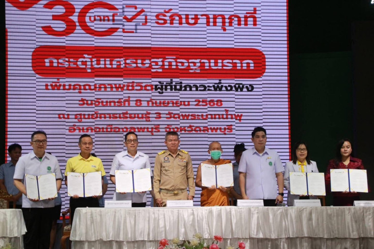 เมื่อวันที่ 8 ก.ย.2568 ณ ห้องประชุมศูนย์การเรียนรู้ 3 วัดพระบาทน้ำพุ ตำบลเขาสามยอด อำเภอเมืองจังหวัดลพบุรี สำนักงานสาธารณสุขจังหวัดลพบุรี จับมือ 5 หน่วยงานพันธมิตร ได้แก่ สำนักงานหลักประกันสุขภาพแห่งชาติ (สปสช.) เขต 4 สระบุรี โรงพยาบาลพระนารายณ์มหาราช เทศบาลเมืองเขาสามยอด ศูนย์อนามัยที่ 4 สระบุรี และวัดพระบาทน้ำพุ จังหวัดลพบุรี เปิดการอบรมผู้ช่วยเหลือดูแลผู้มีภาวะพึ่งพิง (Care Giver) และพิธีลงนามบันทึกข้อตกลงความร่วมมือ (MOU) เพื่อยกระดับคุณภาพชีวิตผู้มีภาวะพึ่งพิง พร้อมทั้งสร้างงานและกระตุ้นเศรษฐกิจฐานราก