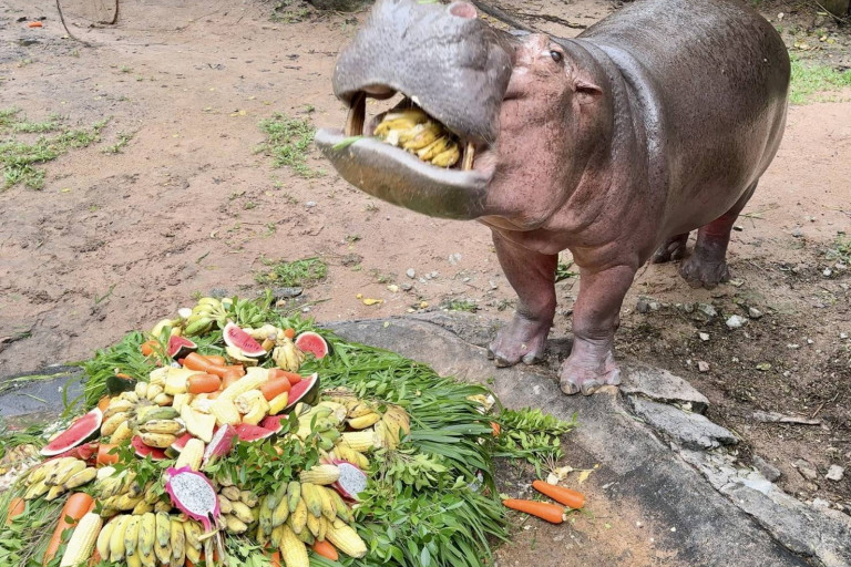 วันที่ 8 ก.ย.2568 ที่ส่วนจัดแสดงฮิปโปโปเตมัส สวนสัตว์เปิดเขาเขียว จ.ชลบุรี นายณรงวิทย์ ชดช้อย ผู้อำนวยการสวนสัตว์เปิดเขาเขียว พร้อมด้วย หัวหน้าส่วนราชการ นักท่องเที่ยว แฟนคลับ และนักเรียน ร่วมฉลองวันเกิดแม่มะลิ ฮิปโปโปเตมัสเพศเมีย อายุ 60 ปี ที่มีอายุยืนมากที่สุดในประเทศไทย บรรยากาศเต็มไปด้วยความอบอุ่นและคึกคัก ร่วมกันร้องเพลงอวยพรวันเกิดและมอบความสุขให้แม่มะลิ ไฮไลท์สำคัญคือ มอบเค้กผลไม้ก้อนยักษ์ สุดพิเศษทั้งผักผลไม้ของโปรดของแม่มะลิ เช่น แก้วมังกร แตงโม แอปเปิ้ล มะละกอ กล้วยน้ำว้า มันเทศ องุ่น แครอท และหญ้าสด ทันทีที่แม่มะลิเดินขึ้นจากสระน้ำใหญ่ ก็ตรงเข้ามารับเค้กอย่างช้า ๆ ตามวัย พร้อมกินอย่างเอร็ดอร่อย ท่ามกลางเสียงร้องเพลง แฮปปี้เบิร์ธเดย์ รอยยิ้ม และเสียงปรบมือจากผู้ร่วมงาน