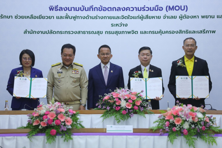 วันที่ 8 ส.ค.68 นายสมศักดิ์ เทพสุทิน รัฐมนตรีว่าการกระทรวงสาธารณสุข เป็นประธานและสักขีพยานร่วมกับ พ.ต.อ.ทวี สอดส่อง รัฐมนตรีว่าการกระทรวงยุติธรรม ในพิธีลงนามบันทึกข้อตกลงความร่วมมือ (MOU) ว่าด้วยการรักษา ช่วยเหลือเยียวยา และฟื้นฟูทางด้านร่างกายและจิตใจแก่ผู้เสียหาย จำเลย ผู้ต้องหา พยาน และบุคคลที่เกี่ยวข้อง ระหว่างสำนักปลัดกระทรวงสาธารณสุข กรมสุขภาพจิต และกรมคุ้มครองสิทธิและเสรีภาพ ลงนามโดยนพ.มณเฑียร คณาสวัสดิ์ รองปลัดกระทรวงสาธารณสุข นพ. กิตติศักดิ์ อักษรวงศ์ อธิบดีกรมสุขภาพจิต และน.ส.เอมอร เสียงใหญ่ อธิบดีกรมคุ้มครองสิทธิและเสรีภาพ