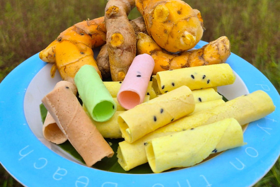 ขมิ้นชัน สมุนไพรคู่ครัวไทยที่คนรู้จักกันดีในเรื่องสรรพคุณทางยาและการปรุงอาหาร วันนี้กำลังถูกต่อยอดสร้างอาชีพใหม่แก่เกษตรกรในพื้นที่ โดยเฉพาะการแปรรูปเป็น “ทองม้วนขมิ้น” ขนมพื้นบ้านรสชาติแปลกใหม่ กลิ่นหอมเฉพาะตัว ที่ขายเพียงถุงละ 25 บาท แต่กลับเพิ่มมูลค่าและรายได้ให้ผู้ผลิตหลายเท่าตัว
