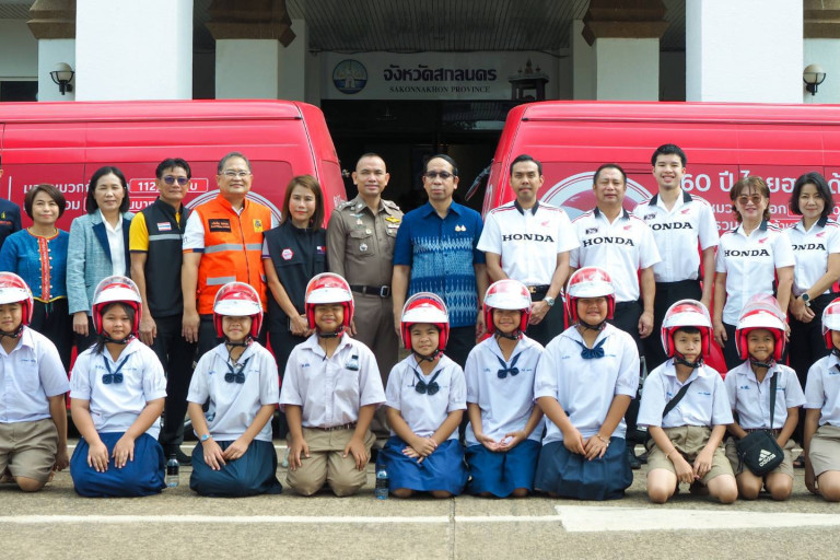 วันที่ 9 กันยายน 2568 ที่ศาลากลางจังหวัดสกลนคร นายชูศักดิ์ รู้ยิ่ง ผู้ว่าราชการจังหวัดสกลนคร ในฐานะผู้อำนวยการศูนย์อำนวยการความปลอดภัยทางถนนจังหวัดสกลนคร พร้อมด้วยหัวหน้าส่วนราชการ ผู้บริหารสถานศึกษา และผู้แทนเยาวชนจากสถาบันการศึกษาในจังหวัดสกลนคร ร่วมรับหมวกกันน็อค ในโครงการฯ ซึ่งมี-นายชาล ทัศน์ประทม ในนามของ บริษัท ไทยฮอนด้า และร้านผู้จำหน่ายรถจักรยานยนต์ฮอนด้าในจังหวัดสกลนคร ร่วมส่งมอบไทยฮอนด้า สานต่อการรณรงค์เพื่อความปลอดภัยทางถนน ด้วยการส่งมอบหมวกกันน็อค จำนวน 60,000 ใบ มูลค่า 60 ล้านบาท และทางผู้จำหน่ายยนต์ฮอนด้าทั่วประเทศ รวมถึงผู้จำหน่ายฯ ในจังหวัด สกลนคร ได้มอบหมวกกันน็อกเพิ่มอีก 52,440 ใบ ทำให้มียอดรวมเป็น 112,440 ใบ มูลค่ากว่า 112 ล้าน ให้กับ 77 จังหวัดทั่วประเทศ