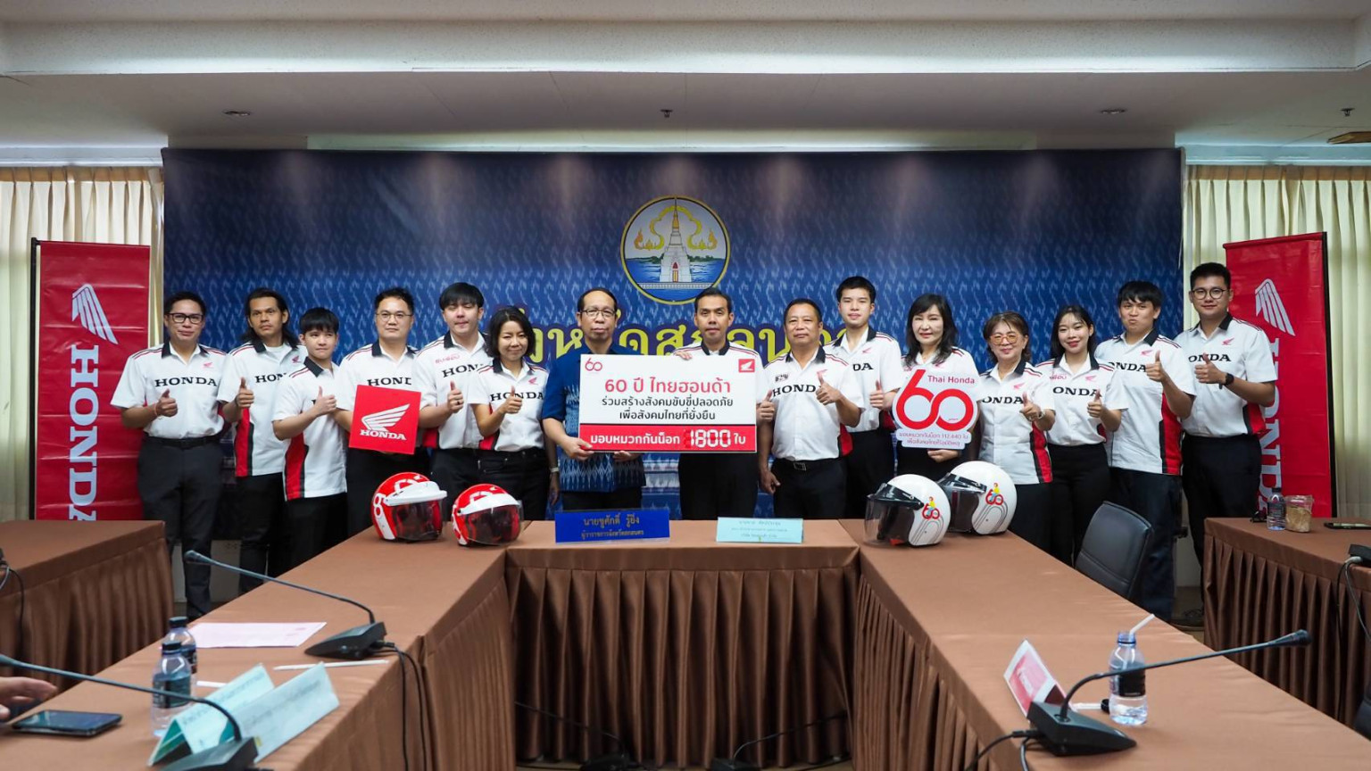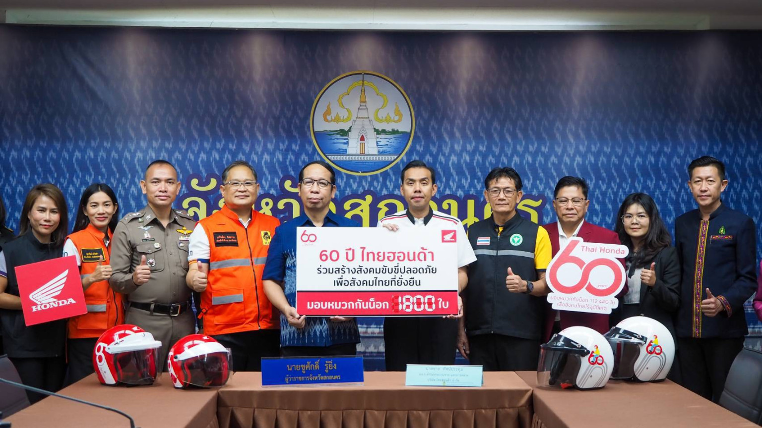โดยในวันนี้ได้มีการจัดสรรการมอบหมวกกันน็อคให้กับจังหวัดสกลนคร เป็นจำนวน 1,800 ใบ โดยหวังให้เป็นจุดเริ่มต้นสำคัญที่ช่วยผลักดันให้การสวมหมวกกันน็อค กลายเป็นวัฒนธรรมความปลอดภัยของประเทศไทยอย่างเป็นรูปธรรม การมอบหมวกกันน็อค เนื่องในโอกาสครบรอบ 60 ของการก่อตั้งบริษัท ไทยฮอนด้า จำกัด ผู้ผลิตและจัดจำหน่ายรถจักรยานยนต์ฮอนด้า และเครื่องยนต์อเนกประสงค์ฮอนด้าในประเทศไทย ร่วมมือกับภาครัฐ และหน่วยงานภาคีเครือข่าย จัดโครงการรณรงค์เพื่อความปลอดภัยทางถนนระดับประเทศ ภายใต้แนวคิด “60 ปี ไทยฮอนด้า ขับขี่ปลอดภัย เพื่อสังคมไทยที่ยั่งยืน” นายชูศักดิ์ รู้ยิ่ง ผู้ว่าราชการจังหวัดสกลนคร กล่าวว่า ภาครัฐให้ความสำคัญกับเรื่องนี้เป็นอย่างยิ่ง และจังหวัดสกลนคร จะเดินหน้าทำงานร่วมกันกับทุกภาคส่วน เพื่อผลักดันให้ "การสวมหมวกนิรภัย" กลายเป็นพฤติกรรมที่ฝังอยู่ในวิถีชีวิตของคนไทย โดยเริ่มต้นจากโรงเรียน ชุมชน จังหวัด และขยายไปสู่สังคมในวงกว้างต่อไป