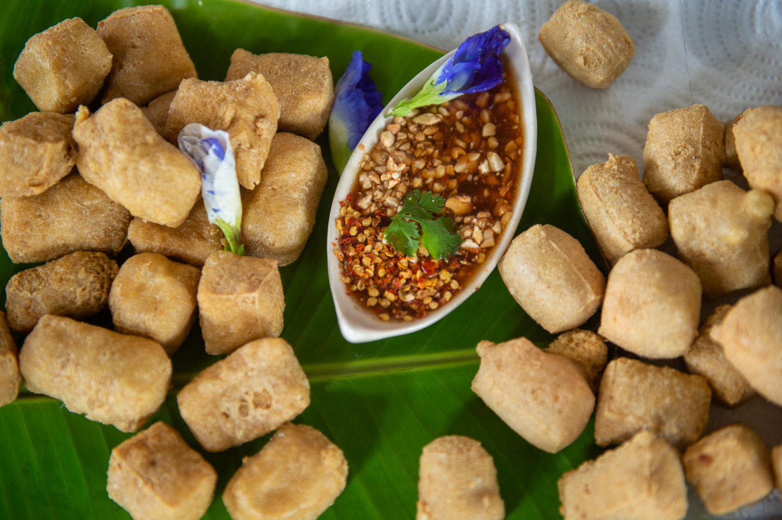 โถ่พูซิ่ง เป็นภาษาไทใหญ่ หมายถึง เต้าหู้ เป็นอาหารของชาวไทใหญ่มาแต่โบราณ ใช้เต้าหู้ทำเป็นกับข้าว นำมาผัดใส่หมู ใส่ขมิ้น และหอมแดง ใส่ต้นหอม ผักชี ต่อมานำมาเป็นอาหารว่างของชาวไทใหญ่ โดยการนำไปทอดให้กรอบนอกนุ่มใน ทานกับน้ำจิ้ม มีประโยชน์จากโปรตีนเพราะทำจากถั่วเหลืองล้วน ๆ คำว่า โถ่พู คือเต้าหู้ คำว่าซิ่ง คือรสชาติที่มัน อร่อย นั่นเอง โดยส่วนประกอบของโถ่พูซิ่ง คือ ถั่วเหลือง นำเปล่า เกลือป่น เบกกิ้งโซดา (Baking Soda) แมกนีเซียมซัลเฟต(ดีเกลือ) โดยมีขั้นตอนการทำดังนี้ 1.ทำความสะอาดถั่วเหลืองและนำไปแช่ไว้ 1 คืน 2.จากนั้นนำถั่วเหลืองไปโม่ แล้วกรองเอาแค่น้ำของถั่วเหลือง 3.แล้วนำไปต้ม และคอยกวน 4.กวนให้ได้ที่ พอมันเดือดใส่ส่วนผสมของแมกนีเซียมซัลเฟต(ดีเกลือ)ลงไป 5.รอให้จับตัวเป็นก้อน เสร็จแล้วก็เทลงแม่พิมพ์ ใช้สิ่งของวัตถุหนักทับไว้ข้างบน จนได้ที่ สำหรับน้ำจิ้มรสเด็ด ใช้ส่วนผสมจากมะขามเปียก เกลือ น้ำตาล และน้ำ โดยการนำมะขามไปแช่น้ำ แล้วนำมากวนให้ได้ที่ ราดหน้าน้ำจิ้มด้วยถั่วลิสงคั่ว และพริกป่น วิธีการทอด โถ่พูซิ่ง 1 ก้อน ตัดให้เป็นลูกเต๋า 4 ชิ้น ใช้น้ำมันพืช หรือ น้ำปาล์ม จะทำให้โถ่พูซิ่งกรอบมากยิ่งขึ้น ตั้งน้ำมันให้ร้อน แล้วนำโถ่พูซิ่งที่ตัดเป็นลูกเต๋าใส่ลงไป อย่าให้ติดกัน คนให้แตกออกเป็นก้อน ๆ รอให้กรอบ และเหลือง ถึงจะสะเด็ดน้ำมัน
