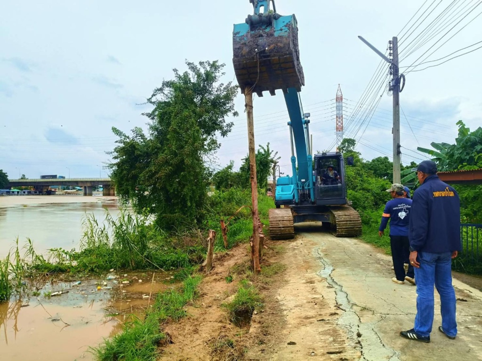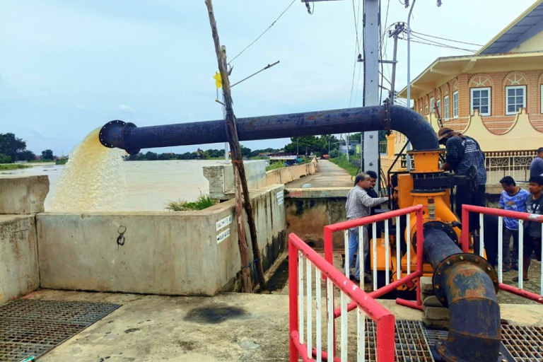 ทต.ป่าโมก เร่งติดตั้งเครื่องสูบน้ำ และเสริมแนวคันดิน ลงเข็มไม้ยูคาเพื่อป้องกันการทรุดตัวของคันดิน