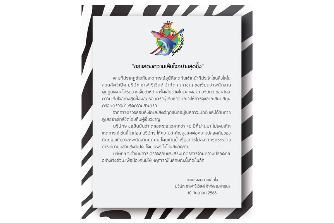 วันที่ 10 ก.ย.2568 จากเจ้าหน้าที่สวนสัตว์ ซาฟารีเวิลด์ ถูกสิงโตทำร้ายจนเสียชีวิต ล่าสุด บริษัท ซาฟารีเวิลด์ จำกัด (มหาชน) ได้ออกแถลงการณ์แสดงความเสียใจ ต่อเหตุการณ์ดังกล่าว
