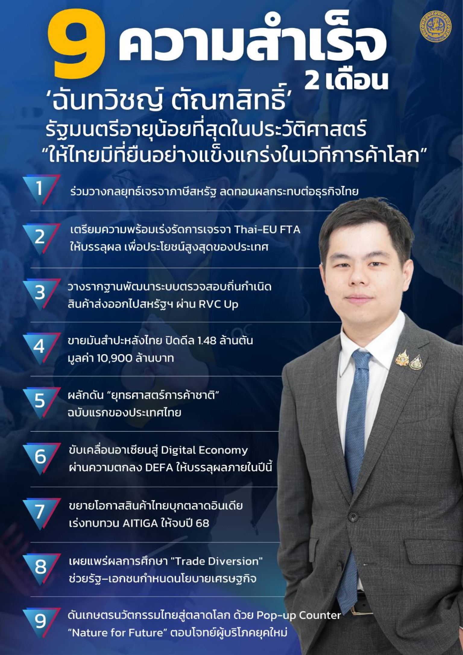 ในช่วง 2 เดือนของการดำรงตำแหน่ง รัฐมนตรีช่วยว่าการกระทรวงพาณิชย์ และเป็นรัฐมนตรีที่อายุน้อยที่สุดในประวัติศาสตร์การเมืองไทย นายฉันทวิชญ์ ตัณฑสิทธิ์ ได้แสดงให้เห็นถึงพลังและวิสัยทัศน์ของคนรุ่นใหม่ ผ่านผลงานสำคัญ 9 เรื่อง ที่เป็นก้าวย่างแรกสู่การวางรากฐานให้เศรษฐกิจและการค้าของไทยในระดับโลก ดังนี้