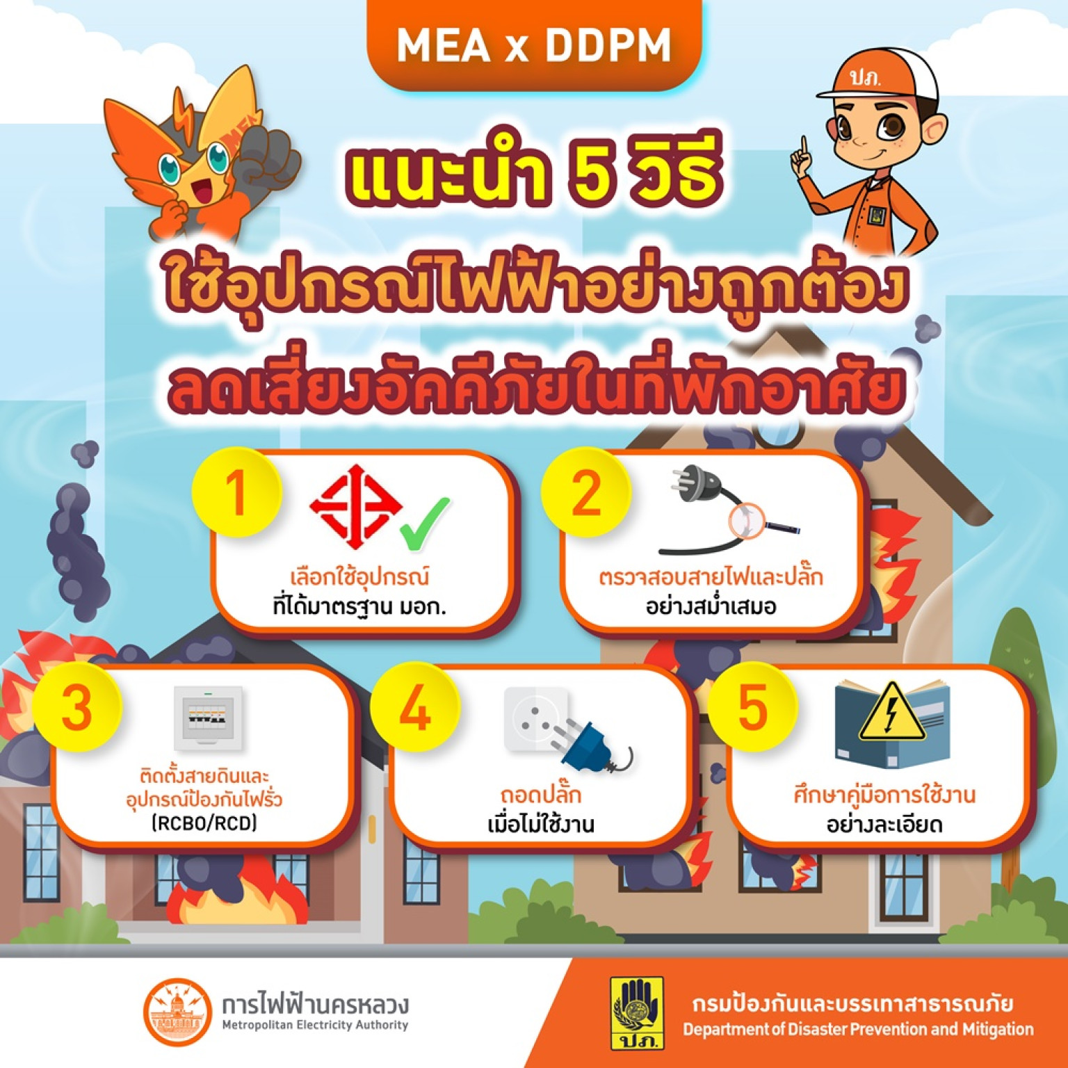 MEA หรือการไฟฟ้านครหลวง ร่วมกับ กรมป้องกันและบรรเทาสาธารณภัย (DDPM) ในฐานะหน่วยงานสังกัดกระทรวงมหาดไทย เล็งเห็นถึงความสำคัญของการใช้อุปกรณ์ไฟฟ้าในชีวิตประจำวัน ที่หากใช้อย่างไม่ถูกต้องอาจก่อให้เกิดอัคคีภัยในบ้านพักอาศัยได้ จึงขอแนะนำแนวทางการใช้อุปกรณ์ไฟฟ้าเพื่อให้เกิดความปลอดภัย ดังนี้
