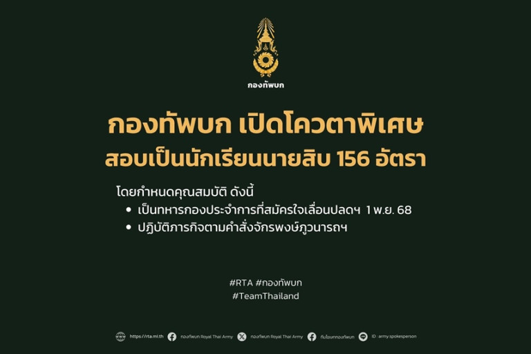 ทั้งนี้ ทหารกองประจำการที่ประสงค์ขอเลื่อนกำหนดปลดประจำการสามารถติดต่อได้ที่ ฝ่ายกำลังพลของหน่วยต้นสังกัด ภายใน 30 กันยายน 2568 นี้ ในส่วนของการสมัครสอบเข้ารับราชการเป็นนักเรียนนายสิบทหารบก ประจำปี 2569 ผู้ที่สนใจสามารถติดตามประกาศหลักเกณฑ์การสมัครสอบอย่างเป็นทางการได้ผ่านทางเว็บไซต์ของกรมยุทธศึกษาทหารบก https://radd-atc.rta.mi.th/ (เปิดรับสมัครช่วงประมาณพฤศจิกายน 2568 เป็นต้นไป)