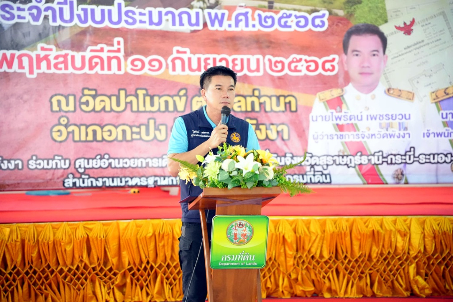 วันที่ 11 ก.ย.68 ที่ศาลาการเปรียญวัดป่าโมกข์ ต.ท่านา อ.กะปง นายไพรัตน์ เพชรยวน ผู้ว่าราชการจังหวัดพังงา เป็นประธานในพิธีการมอบโฉนดที่ดินตามโครงการ "มอบโฉนดที่ดินทั่วไทย นำสุขคลายทุกข์ให้ประชาชน" ประจำปีงบประมาณ พ.ศ. 2568 โดยมีส่วนราชการ องค์กรปกครองส่วนท้องถิ่น ผู้นำท้องถิ่นท้องที่ ร่วมมอบและเป็นสักขีพยาน การมอบโฉนดครั้งนี้อยู่ในพื้นที่หมู่ที่ 2 หมู่ที่ 3 และหมู่ที่ 4 ต.เหมาะ อ.กะปง รวมจำนวนเนื้อที่ 334 ไร่ 2 งาน 30 ตารางวา