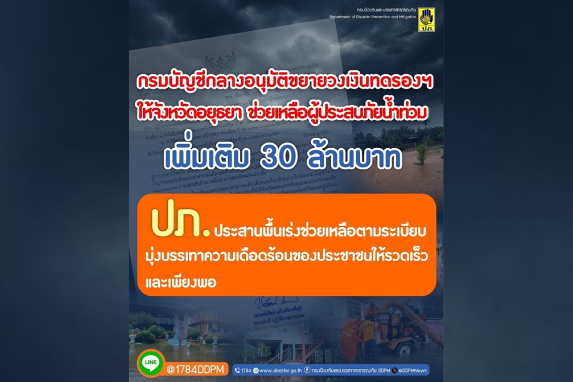 กรมป้องกันและบรรเทาสาธารณภัย เปิดเผยว่า จากสถานการณ์อุทกภัยในพื้นที่จังหวัดพระนครศรีอยุธยา ซึ่งเกิดจากเขื่อนเจ้าพระยาระบายน้ำทำให้น้ำเอ่อล้นเข้าท่วมบ้านเรือนประชาชนในพื้นที่ อ.เสนา อ.ผักไห่ อ.บางบาล อ.บางไทร อ.พระนครศรีอยุธยา และ อ.บางปะอิน ซึ่งมีลักษณะเป็นบ้านใต้ถุนสูงนอกแนวคันกั้นน้ำ ทำให้ประชาชนรวม 6 อำเภอ 83 ตำบล 478 หมู่บ้าน 10 ชุมชน ประชาชน 17,223 ครัวเรือน 63,725 คน ได้รับผลกระทบ ปัจจุบันระดับน้ำยังคงเพิ่มสูงขึ้น และวงเงินทดรองราชการในอำนาจผู้ว่าราชการจังหวัดที่มีอยู่ 20 ล้านบาท ไม่เพียงพอในการช่วยเหลือประชาชน จึงได้ประสานมายังกรมป้องกันและบรรเทาสาธารณภัย ขอขยายวงเงินทดรองราชการในอำนาจผู้ว่าราชการจังหวัดไปยังกรมบัญชีกลาง เพื่อให้สามารถช่วยเหลือผู้ประสบอุทกภัยได้อย่างทั่วถึง