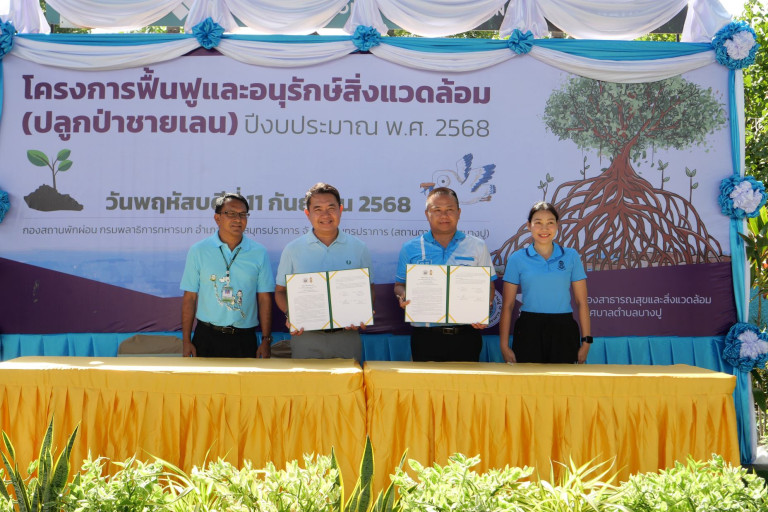 นายธีรพล ชุนเจริญ นายกเทศมนตรีตำบลบางปู เป็นประธานในพิธีเปิดและพิธีลงนามบันทึกข้อตกลงความร่วมมือ (MOU) กิจกรรมฟื้นฟูและอนุรักษ์สิ่งแวดล้อม ระหว่างเทศบาลตำบลบางปู และกองสถานพักผ่อน กรมพลาธิการทหารบก ซึ่งการจัดกิจกรรมปลูกป่ามีวัตถุประสงค์เพื่อเพิ่มพื้นที่ป่าชายเลน สร้างความสมดุลในระบบนิเวศ ให้เป็นประโยชน์แก่ประชาชนโดยรวม โดยการให้ความรู้ สร้างความเข้าใจ ความตระหนักให้เห็นคุณค่าและความสำคัญของป่าชายเลน โดยมีนายณัฏฐพร พรหมมาศ รองปลัดเทศบาล และพันเอกธีระธรรม มานุช รองผู้อำนวยการ กองสถานพักผ่อน กรมพลาธิการทหารบก ร่วมเป็นสักขีพยานบันทึกข้อตกลงความร่วมมือ โดยได้รับความร่วมมือจากภาคประชาชน ผู้แทนชุมชนในเขตเทศบาลตำบลบางปู รวมจำนวน 400 คน เข้าร่วม