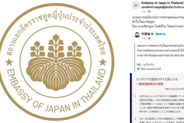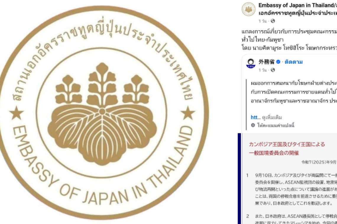 ผู้สื่อข่าวรายงานว่า เมื่อวันที่ 11 กันยายน 2568 เพจ Embassy of Japan in Thailand /สถานเอกอัครราชทูตญี่ปุ่นประจำประเทศไทย ได้โพสต์ข้อความเผยแพร่แถลงการณ์เกี่ยวกับการประชุมคณะกรรมการชายแดนทั่วไปไทย-กัมพูชา โดย นายคิตามูระ โทชิฮิโระ โฆษกกระทรวงการต่างประเทศญี่ปุ่น มีใจความว่า