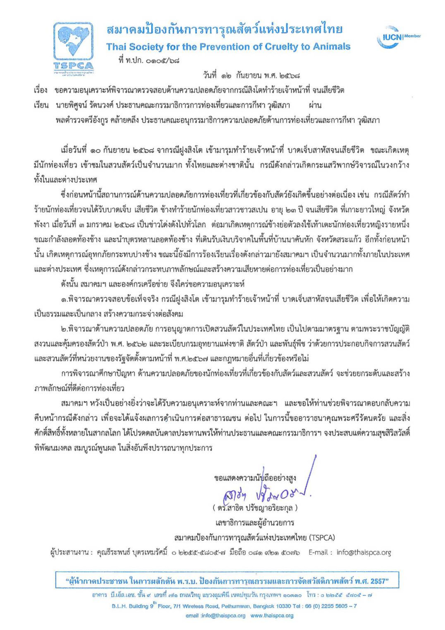 ซึ่งการพิจารณาศึกษาปัญหา ด้านความปลอดภัยของนักท่องเที่ยวที่เกี่ยวข้องกับสัตว์และสวนสัตว์ จะช่วยยกระดับและสร้างภาพลักษณ์ที่ดีต่อการท่องเที่ยว และขอให้ท่านช่วยพิจารณาตอบกลับความคืบหน้ากรณีดังกล่าว เพื่อจะได้แจ้งผลการดำเนินการต่อสาธารณชน ซึ่งการดำเนินก่อนหน้านี้ ทาง TSPCA และองค์กรเครือข่าย เคยยื่นหนังสือติดตามเรื่องดังกล่าว มาแล้ว 2 ครั้ง แต่ยังไม่เคยได้รับคำตอบ จนมาเกิดเหตุขึ้นในครั้งนี้ หวังว่าจะได้รับคำตอบและแนวทางปฏิบัติที่เป็นรูปธรรมในการแก้ไขปัญหาในทุกมิติและรอบด้าน ต่อไป