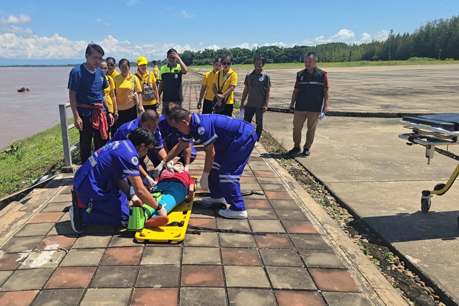 จังหวัดหนองคาย ร่วมกับสถาบันการแพทย์ฉุกเฉินแห่งชาติ (สพฉ.) และหน่วยงานภาคีเครือข่าย ซ้อมแผนลำเลียงผู้ป่วยทางน้ำและทางอากาศรับมือเทศกาลออกพรรษา บั้งไฟพญานาคโลก ตุลาคม 2568
