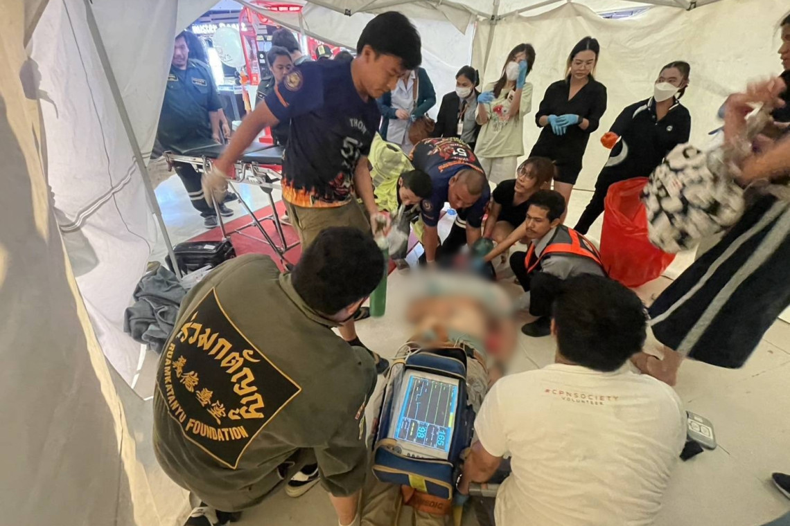 ที่เกิดเหตุ บริเวณ ชั้น 1 ลานหน้าซุปเปอร์มาเก็ต พบผู้บาดเจ็บทราบชื่อ นายเอ (นามสมมุติ) อายุ 21 ปี สวมเสื้อรุ่นของมหาวิทยาลัยชื่อดังย่านบางเขน ใส่กางเกงขายาวสีครีม นอนจมกองเลือดในสภาพหมดสติ มีบาดแผลศีรษะด้านหลังขนาดใหญ่ และข้อเท้าด้านขวาหักผิดรูป เจ้าหน้าที่พยาบาลของศูนย์การค้าร่วมกับทีมแพทย์ที่ใช้บริการภายในศูนย์พยายามช่วยเหลือโดยทำ CPR ก่อนรีบนำตัวส่ง โรงพยาบาลเกษมราษฎร์ รัตนาธิเบศร์ ขณะที่เจ้าหน้าที่รักษาความปลอดภัยกั้นพื้นที่และกันผู้ที่ไม่เกี่ยวข้องออกจากจุดเกิดเหตุ