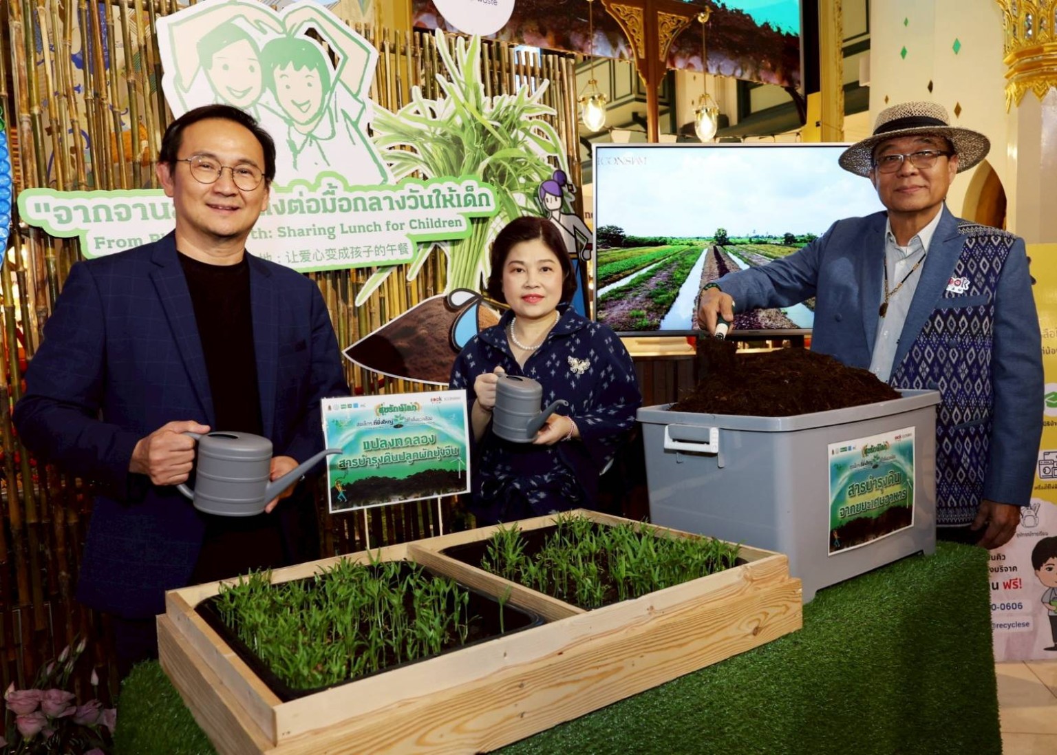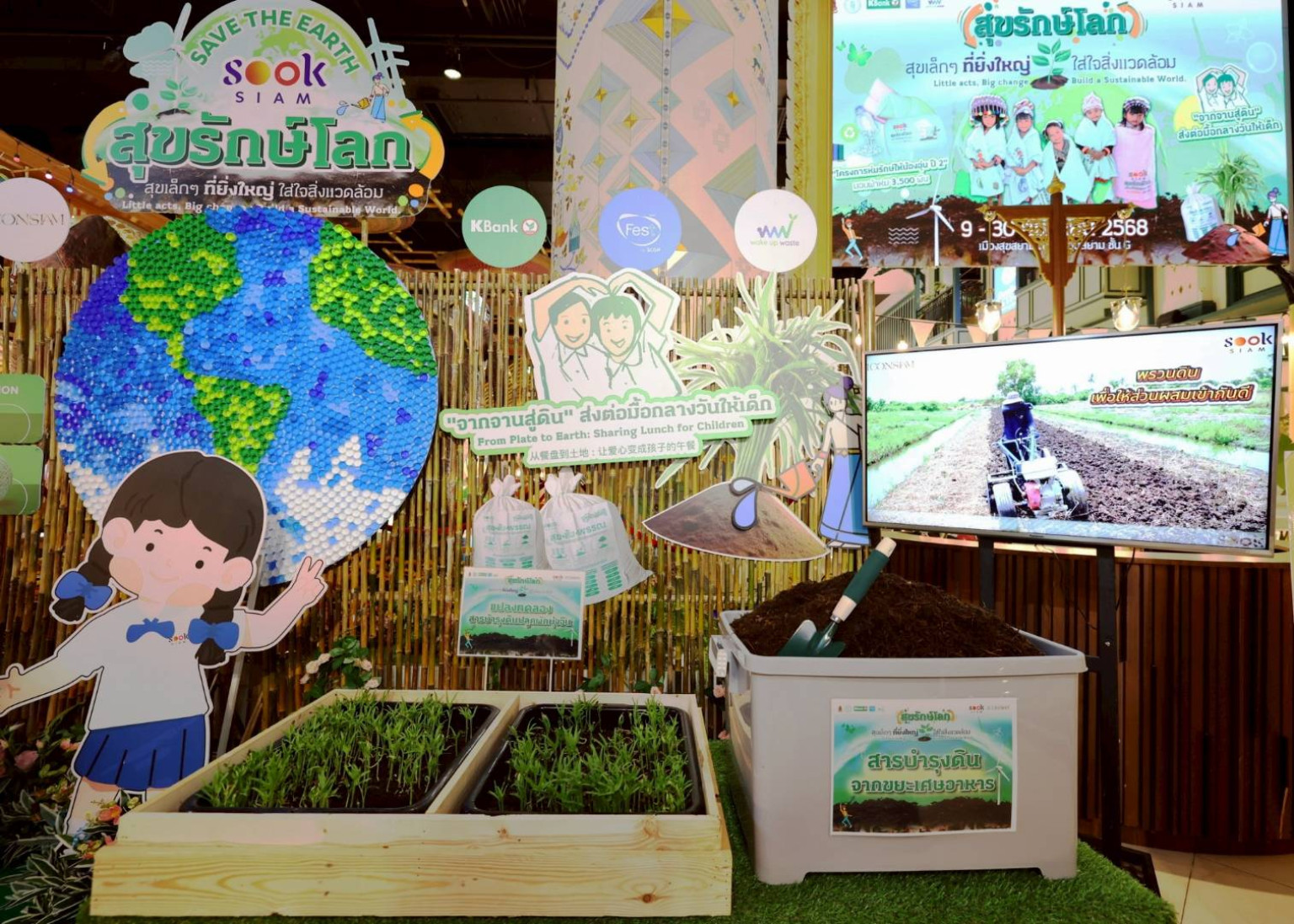 โดยในปี 2568 นี้ เมืองสุขสยามได้ต่อยอด “สารบำรุงดิน” ด้วยโครงการ “จากจานสู่ดิน ส่งต่อมื้อกลางวันให้เด็ก” ร่วมกับเกษตรกรเจ้าของสวนลูกหลานตาเต่า อำเภอลาดบัวหลวง จังหวัดพระนครศรีอยุธยา นำสารบำรุงดินที่ได้จากขยะเศษอาหารในเมืองสุขสยาม ไปใช้ในกระบวนการเพาะปลูกผักบุ้งจีน เพื่อนำส่งต่อครัวโรงเรียนในโครงการอาหารกลางวันให้กับโรงเรียนในเขตคลองสานและโรงเรียนใกล้เคียง เชื่อมโยงเป็นวงจรอาหาร ตั้งแต่ครัวเรือน โรงเรียน จนถึงการบริโภคของเด็ก ๆ ส่งต่อความสุขสู่ชุมชนและสังคมอย่างยั่งยืนมากขึ้น และยังเพิ่มจำนวนการผลิตผ้าห่มรักษ์โลกเป็น 3,500 ผืน เพื่อส่งมอบให้กับเด็กเล็กในโรงเรียนจังหวัดทางภาคเหนือจำนวน 30 โรงเรียน นอกจากนี้ยังส่งเสริมให้ผู้ประกอบการร้านค้าในเมืองสุขสยาม มีความรับผิดชอบต่อสังคมและสิ่งแวดล้อม ด้วยการใช้ผลิตภัณฑ์ภาชนะรักษ์โลก “Fest Bio Brown” นวัตกรรมบรรจุภัณฑ์อาหารเป็นมิตรกับสิ่งแวดล้อม ที่ร่วมกับธนาคารกสิกรไทย และบริษัท ผลิตภัณฑ์กระดาษไทย จำกัด ใน Fest by SCGP พัฒนาขึ้นจากเยื่อยูคาลิปตัส 100% สามารถย่อยสลายได้เองตามธรรมชาติภายใน 60 วัน อีกทั้งยังส่งต่อขวดพลาสติก กระป๋องน้ำพลาสติก และลังกระดาษให้ Wake Up Waste แพลตฟอร์มซื้อขายขยะรีไซเคิล นำไปเปลี่ยนเป็นผลิตภัณฑ์รักษ์โลกที่สร้างมูลค่าได้