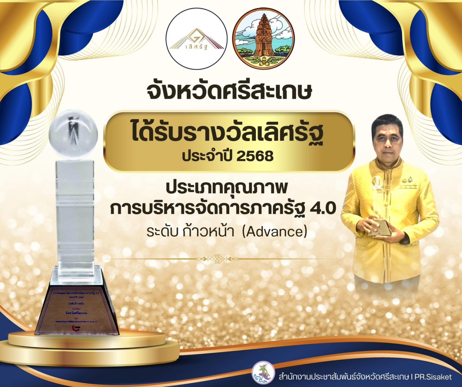 สำนักงาน ก.พ.ร. ได้ประกาศรายชื่อผลงานที่ผ่านเกณฑ์การประเมินรางวัลเลิศรัฐ ประจำปี 2568 ประกอบด้วยสาขาบริการภาครัฐ สาขาการบริหารราชการแบบมีส่วนร่วม และสาขาคุณภาพการบริหารจัดการภาครัฐ เพื่อส่งเสริมการยกระดับประสิทธิภาพการให้บริการภาครัฐในการอำนวยความสะดวก ส่งเสริมคุณภาพ ชีวิตที่ดีขึ้นของประชาชน ผลักดันและส่งเสริมการมีส่วนร่วมของประชาชนในการบริหารราชการให้เกิดผลในทางปฏิบัติอย่างเป็นรูปธรรมและยั่งยืน รวมทั้งส่งเสริมให้หน่วยงานของรัฐ ยกระดับมาตรฐานให้เทียบเท่าสากล เพื่อมุ่งสู่องค์การที่เป็นเลิศ ซึ่งจังหวัดศรีสะเกษได้รับรางวัลเลิศรัฐ ประจำปี 2568 ประเภทคุณภาพการบริหารจัดการภาครัฐ 4.0 ระดับก้าวหน้า (Advance) ซึ่งรางวัลดังกล่าวเป็นรางวัลที่มอบให้แก่หน่วยงานที่มุ่งเน้นการพัฒนาความเป็นเลิศด้านคุณภาพการบริหารจัดการภาครัฐ ที่มีประสิทธิภาพและประสิทธิผล มีความโดดเด่น และมีแนวทางปฏิบัติที่เป็นเลิศ เกิดผลลัพธ์ที่สร้างคุณค่าแก่ผู้รับบริการและผู้มีส่วนได้ส่วนเสีย สะท้อนถึงความสำเร็จในการพัฒนาองค์กรเพื่อมุ่งสู่ระบบราชการ 4.0 เพื่อยกระดับคุณภาพชีวิตที่ดีของประชาชน มุ่งเน้นการทำงานที่ยึดประชาชนเป็นศูนย์กลาง เป็นภาครัฐที่เปิดกว้างและเชื่อมโยงกัน และพัฒนาองค์กรให้มีขีดสมรรถนะสูงและทันสมัย