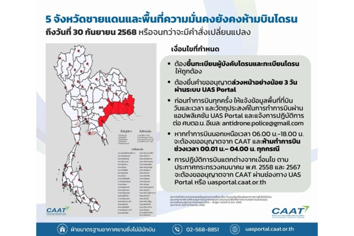 วันที่ 14 กันยายน 2568 สำนักงานการบินพลเรือนแห่งประเทศไทย (กพท.) หรือ CAAT ออกประกาศฉบับที่ 6 เรื่อง “ห้ามบังคับหรือปล่อยอากาศยานซึ่งไม่มีนักบิน (Drone) ในพื้นที่ที่อาจกระทบต่อความมั่นคงของประเทศในช่วงสถานการณ์ชายแดนไทย–กัมพูชา” โดยยกเลิกประกาศฉบับที่ 5 ที่มีผลบังคับใช้ถึงวันที่ 15 กันยายน 2568 ขยายเวลาไปจนถึงวันที่ 30 กันยายน 2568 หรือจนกว่าจะมีประกาศเปลี่ยนแปลง