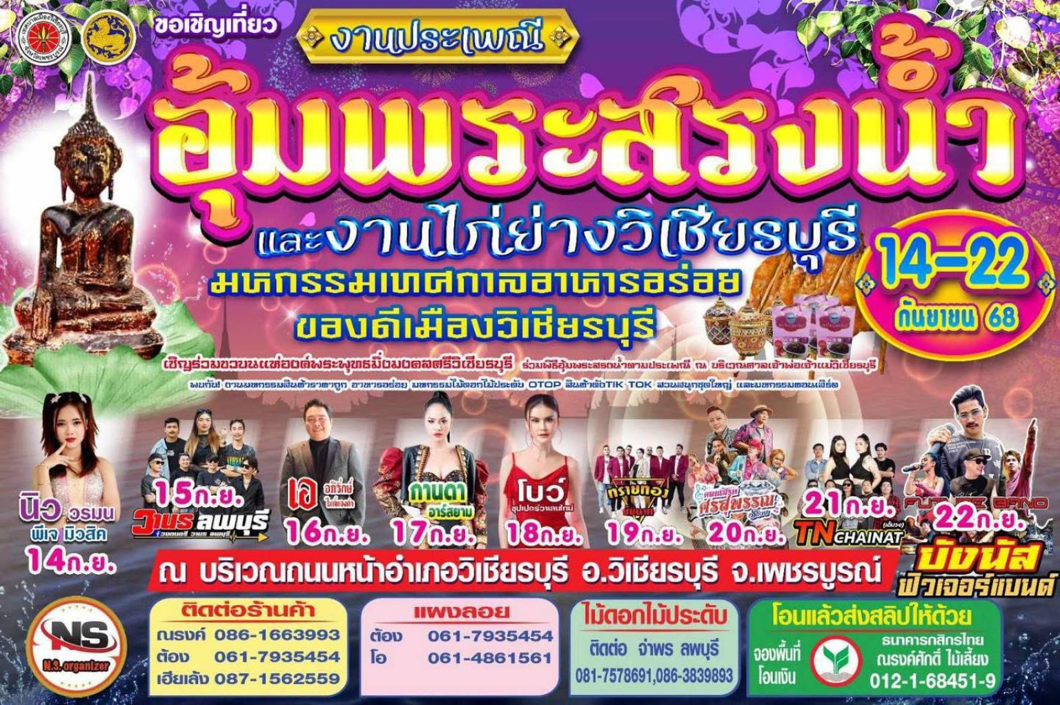 วันที่ 14 กันยายน 2568 ผู้สื่อข่าวรายงานว่า อำเภอวิเชียรบุรี จัดงานอุ้มพระสงฆ์น้ำ และงานไก่ย่างวิเชียรบุรี มหกรรมเทศกาลอาหารอร่อย ของดีเมืองวิเชียรบุรี จังหวัดเพชรบูรณ์ งานนี้ทางผู้ดำเนินการได้กำหนดจัดให้มีขึ้น ระหว่างวันที่ 14-22 กันยายน 2568 รวม 9 วัน ณ บนถนนใหญ่สายหลัก บริเวณตั้งแต่หัวสะพานข้ามแม่น้ำไปจนถึง หน้าที่ว่าการอำเภอวิเชียรบุรี ระยะทางยาวประมาณ 1 กิโลเมตรเศษ ที่สำคัญถนนสายดังกล่าวเป็นถนนใหญ่สายหลักเข้าสู่ตัวเมืองวิเชียรบุรี และมีประชาชนใช้ในในการเดินทางสัญจรไปมา จึงฝากเรื่องนี้ผ่านสื่อมวลชนถึง นายศรัณยู มีทองคำ ผวจ.เพชรบูรณ์ พิจารณาดำเนินการเพื่อประโยชน์สาธารณะ