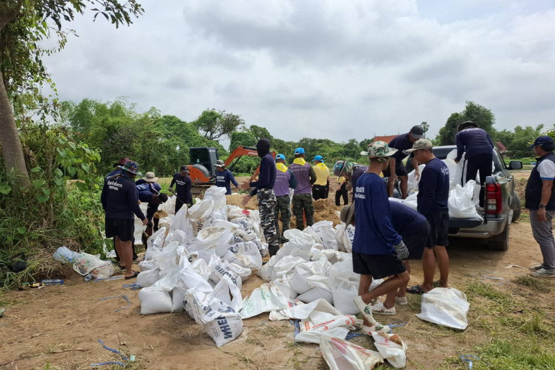 วันที่ 15 ก.ย.2568 เวลา 11.00 น. ที่บริเวณหมู่ที่ 5 ตำบลโผงเผง อำเภอป่าโมก จังหวัดอ่างทอง ลงพื้นที่ตำบลโผงเผง อำเภอป่าโมก จังหวัดอ่างทอง นายชวนินทร์ วงศ์สถิตจิรกาล ผู้ว่าราชการจังหวัดอ่างทอง นางศุทธิกานต์ วงศ์สถิตจิรกาล ประธานแม่บ้านมหาดไทยจังหวัดอ่างทอง นายภราดร ปริศนานันทกุล ส.ส.อ่างทอง นายธิตินัย พาติกบุตร ผู้บัญชาการเรือนจำจังหวัดอ่างทอง นายมนตรี โตศิลปกิจ นายกองค์การบริหารส่วนตำบลโผงเผง ได้ได้นำผู้ต้องขังมาร่วมกับชาวบ้านและทหาร ในการกรอกกระสอบทรายกั้นแนวริมตลิ่งเพื่อไม่ให้น้ำทะลักเข้าในชุมชนพื้นที่ตำบลหมู่ที่ 5-6 ตำบลโผงเผง อำเภอป่าโมก ทำให้ระดับน้ำในคลองโผงเผง สาขาแม่น้ำเจ้าพระยา เพิ่มสูงต่อเนื่อง ขณะนี้มีบ้านเรือนนอกคันกั้นน้ำถูกน้ำท่วมแล้วกว่า 90 หลังคาเรือน หากระดับน้ำยังสูงขึ้น อาจไหลเข้าท่วมพื้นที่ ม.4 อีกกว่า 80 หลังคาเรือน ส่วนบ้านเรือนริมคลอง ม.5–6 กว่า 200 หลังคาเรือน ขณะนี้อยู่ระหว่างเร่งเสริมกระสอบทรายเพื่อป้องกันน้ำล้นตลิ่ง