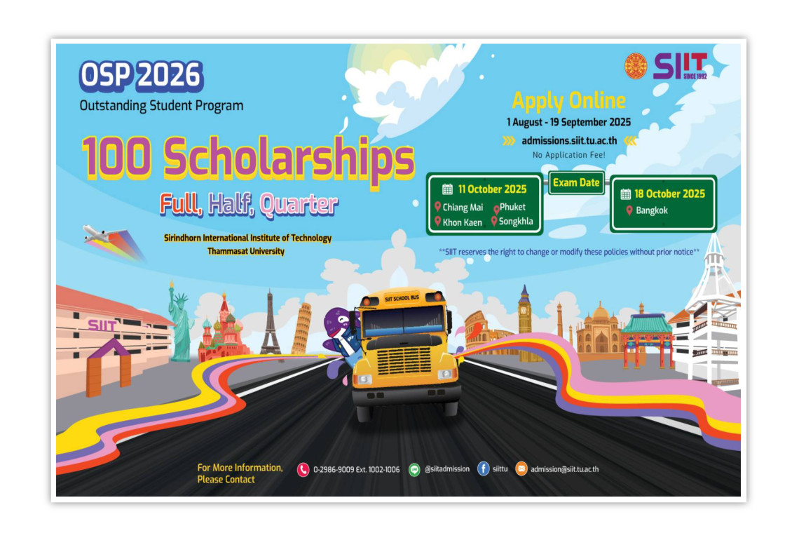 สถาบันเทคโนโลยีนานาชาติสิรินธร มหาวิทยาลัยธรรมศาสตร์ (SIIT) เปิดรับสมัครนักเรียน และนักศึกษาเข้าร่วมโครงการสอบชิงทุนสำหรับนักเรียนที่มีผลการเรียนดีเลิศ "Outstanding Student Program (OSP 2026)" ประจำปีการศึกษา 2569 จำนวนกว่า 100 ทุน เพื่อเปิดโอกาสการเรียนรู้ศาสตร์ด้านวิศวกรรมและเทคโนโลยีที่สอดรับกับการแข่งขันในบริบทโลก รวมถึงโอกาสเติบโตในระดับนานาชาติ โดยทุนดังกล่าวครอบคลุมค่าใช้จ่ายระยะเวลาการศึกษาในหลักสูตรปริญญาตรี 4 ปี ผู้สมัครต้องเป็นผู้ที่กำลังศึกษาอยู่ในระดับชั้น ม. 6 หรือ สำเร็จการศึกษาระดับมัธยมศึกษาปีที่ 6 หรือเทียบเท่า และมีเกรดเฉลี่ยสะสม (GPA) ตลอด 4 ภาคการศึกษา ระดับมัธยมศึกษาปีที่ 4 – 5 ไม่ต่ำกว่า 2.50 โดยในปีนี้สถาบัน ยังได้เพิ่มศูนย์สอบทั่วประเทศเป็น 5 แห่ง ได้แก่ จังหวัดเชียงใหม่ ขอนแก่น ภูเก็ต สงขลา ที่กำหนดสอบในวันที่ 11 ตุลาคม 2568 และศูนย์สอบที่กรุงเทพฯ จะจัดสอบในวันที่ 18 ตุลาคม 2568 นี้