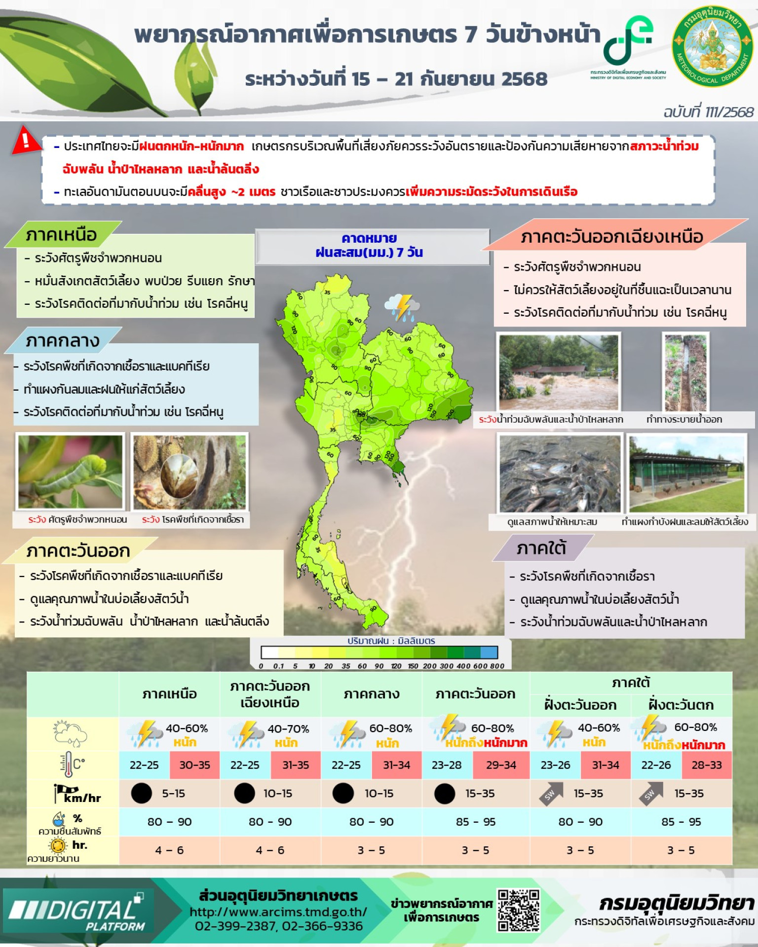 “กรมอุตุ”เตือน ฝนตกหนักทั่วไทย เสี่ยงน้ำท่วมฉับพลัน-น้ำป่าไหลหลาก “เกษตรกร” ระวังโรคพืช 15–21 ก.ย.68