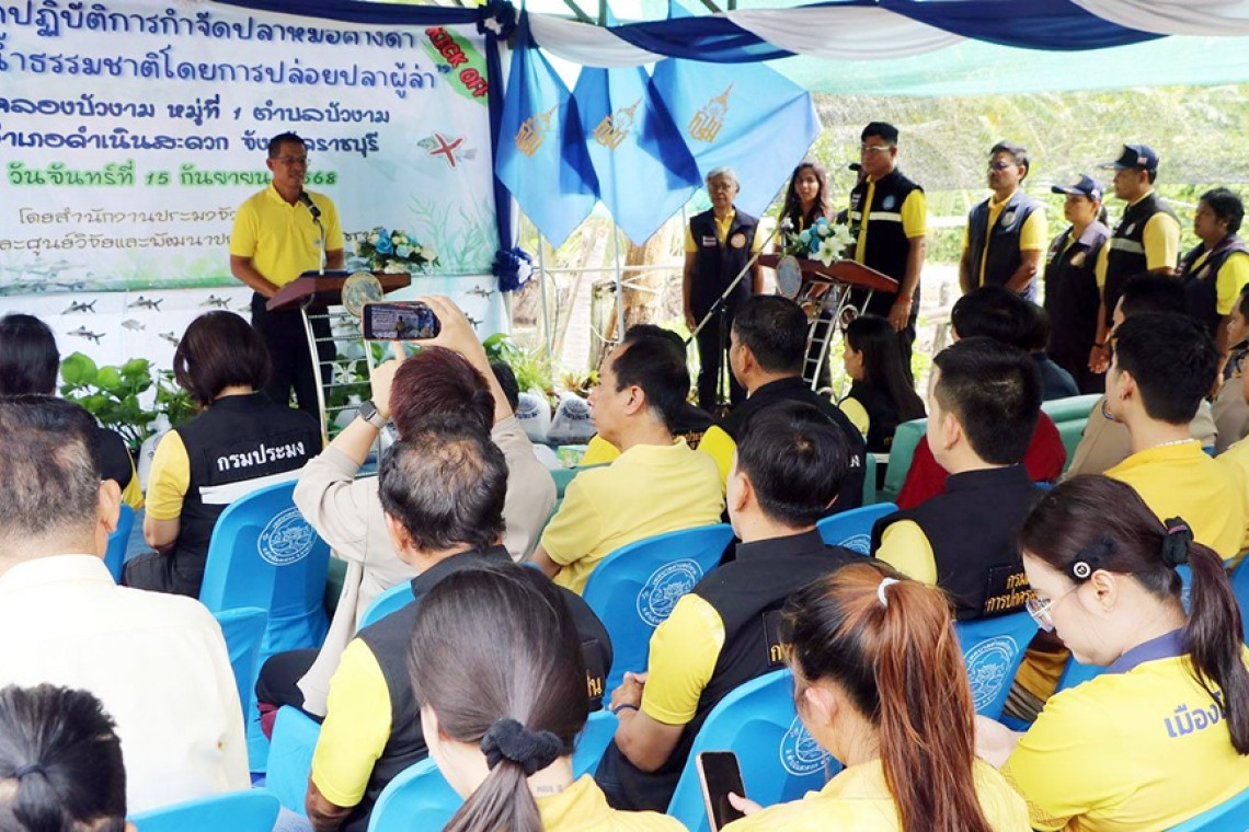 วันที่ 15 ก.ย. 68 นายสุวัฐน์ วงศ์สุวัฒน์ รองอธิบดีกรมประมง พร้อมคณะกรมประมง นายอำนาจ จีนขาวขำ ประมงจังหวัดราชบุรี นางสาวสุรังษี ทัพพะรังสี ผู้อำนวยการศูนย์วิจัยและพัฒนาการเพาะเลี้ยงสัตว์น้ำจืดราชบุรี นายสุพัฒน์ อ่อนคง เกษตรจังหวัดราชบุรี นายกุลฑล ปูรณวัฒนกุล ประธานเครือข่ายธุรกิจ บิสคลับประเทศไทย พร้อมส่วนราชการ กำนัน ผู้ใหญ่บ้าน ผู้นำชุมชน และประชาชน ร่วมกันจัดกิจกรรมเปิดปฏิบัติการกำจัดปลาหมอคางดำในแหล่งน้ำธรรมชาติ บริเวณคลองบัวงาม ต.บัวงาม อ.ดำเนินสะดวก จ.ราชบุรี โดยรองอธิบดีกรมประมง พร้อมประมงจังหวัด ได้เหวี่ยงแหจับปลาในแหล่งน้ำได้ปลาหมอคางดำติดแหขึ้นมาด้วย