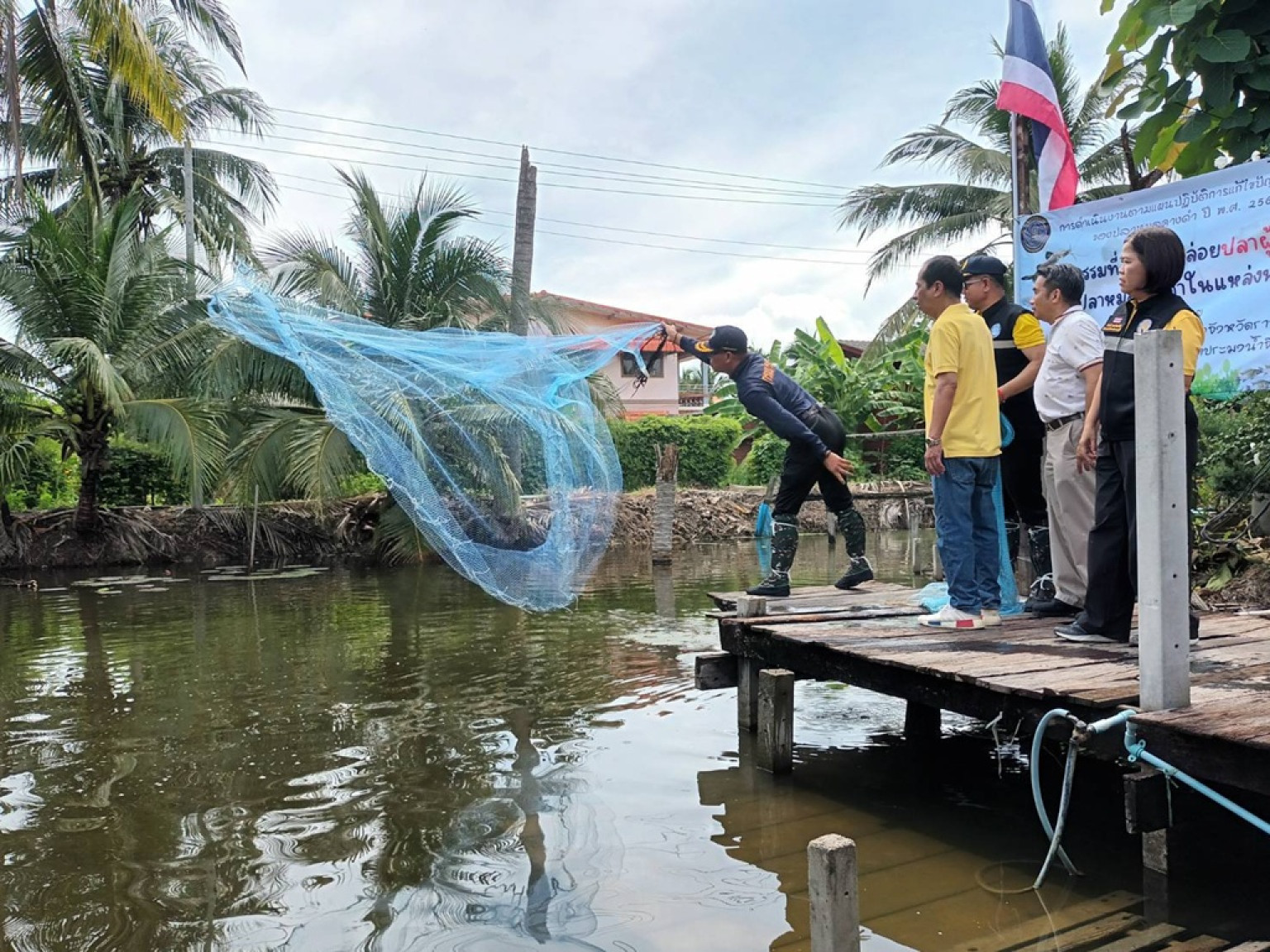 รองอธิบดีกรมประมงเหวี่ยงแหจับปลาหมอคางดำ พร้อมปล่อยปลาผู้ล่าลงคลองบัวงาม อ.ดำเนินสะดวก จ.ราชบุรี ลดการแพร่ระบาด