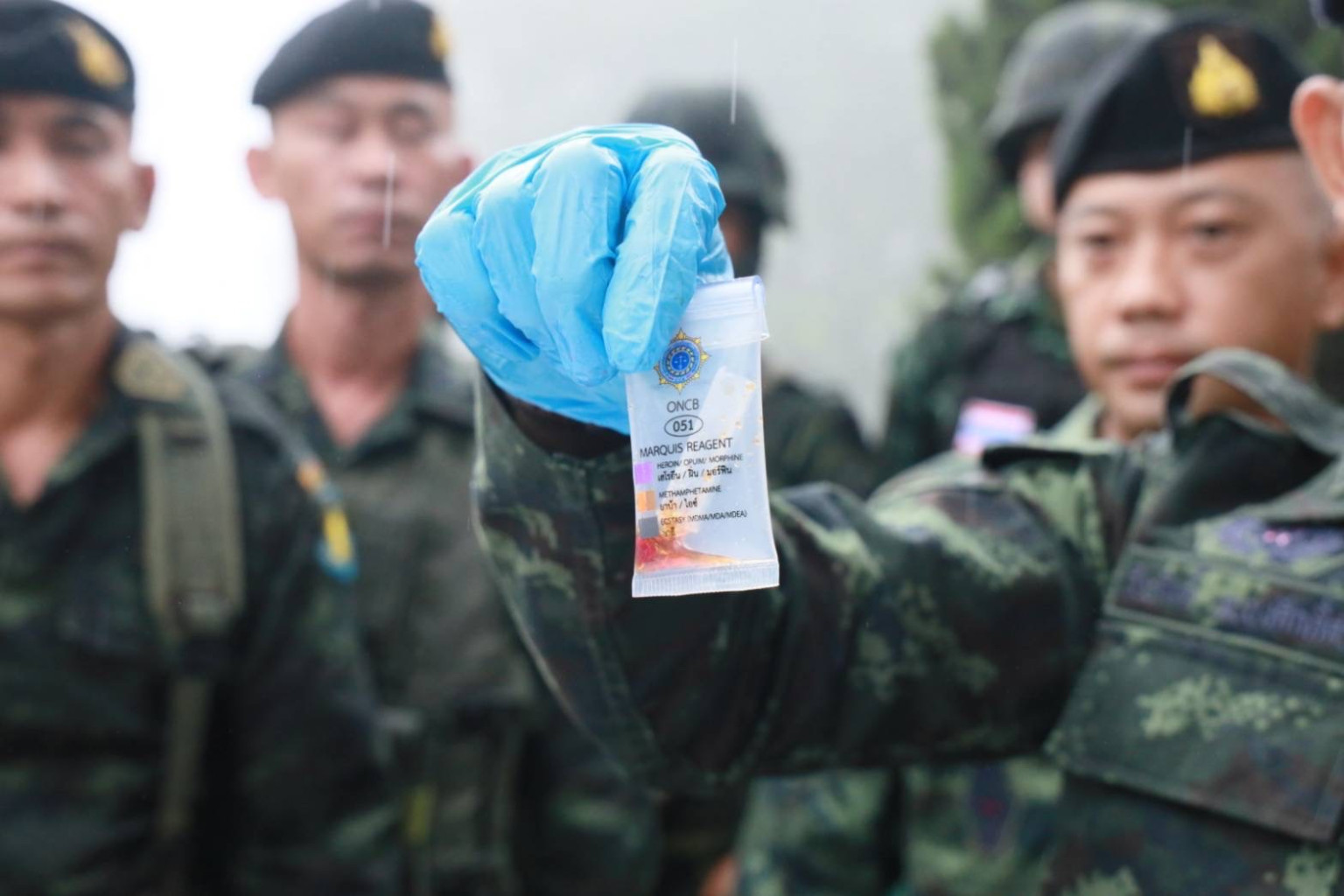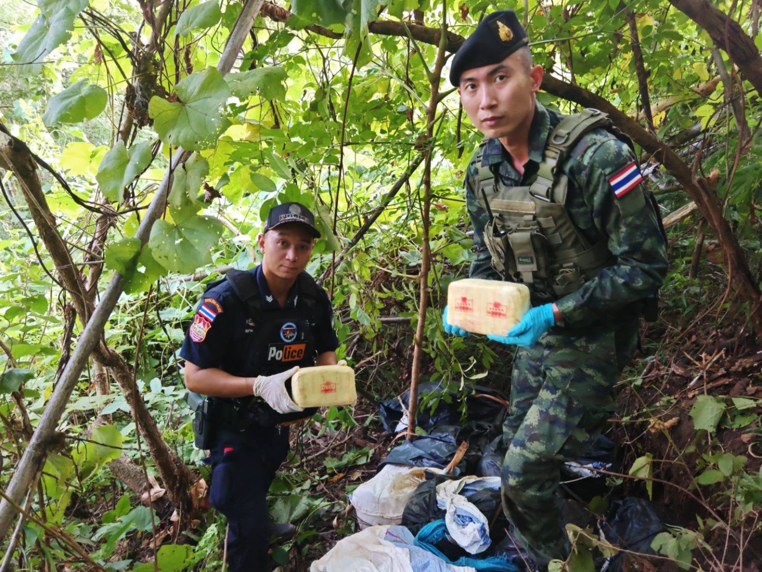อย่างไรก็ตามกลุ่มคนดังกล่าวได้ใช้อาวุธปืนไม่ทราบชนิดและขนาดยิงใส่เจ้าหน้าที่ ทำให้เกิดการปะทะกันขึ้นนานประมาณ 5 นาที สิ้นเสียงปืนเจ้าหน้าที่ทหารทุกนายปลอดภัยส่วนคนร้ายหลบหนีเข้าป่าไปได้ แต่ได้ทิ้งสัมภาระที่แบกมาเป็นกระสอบฟางตกกระจัดกระจายตามแนวป่าเป็นจำนวนมาก ทางหน่วยได้ทำการพิสูจน์ทราบพื้นที่โดยรอบตรวจพบกระสอบดัดแปลง 15 กระสอบ ภายในบรรจุยาเสพติดให้โทษ ประเภท 1 (ยาบ้า) กระสอบละ 360,000 เม็ด จำนวน 1 กระสอบ, กระสอบละ 350,000 เม็ด จำนวน 2 กระสอบ, กระสอบละ 340,000 เม็ด จำนวน 3 กระสอบ, กระสอบละ 330,000 เม็ด จำนวน 3 กระสอบ, กระสอบละ 320,000 เม็ด จำนวน 1 กระสอบ, กระสอบละ 230,000 เม็ด จำนวน 3 กระสอบ, กระสอบละ 110,000 เม็ด จำนวน 1 กระสอบ, กระสอบละ 108,000 เม็ด จำนวน 1 กระสอบ รวมทั้งสิ้น 4,298,000 เม็ด จึงได้ยึดไว้เป็นของกลางและนำไปเก็บไว้เป็นของกลางพร้อมประสาน สภ.แม่ฟ้าหลวง และหน่วยงานที่เกี่ยวข้องเข้าไปตรวจสอบรวมทั้งวางกำลังสกัดกั้นอย่างเข้มงวดต่อไป