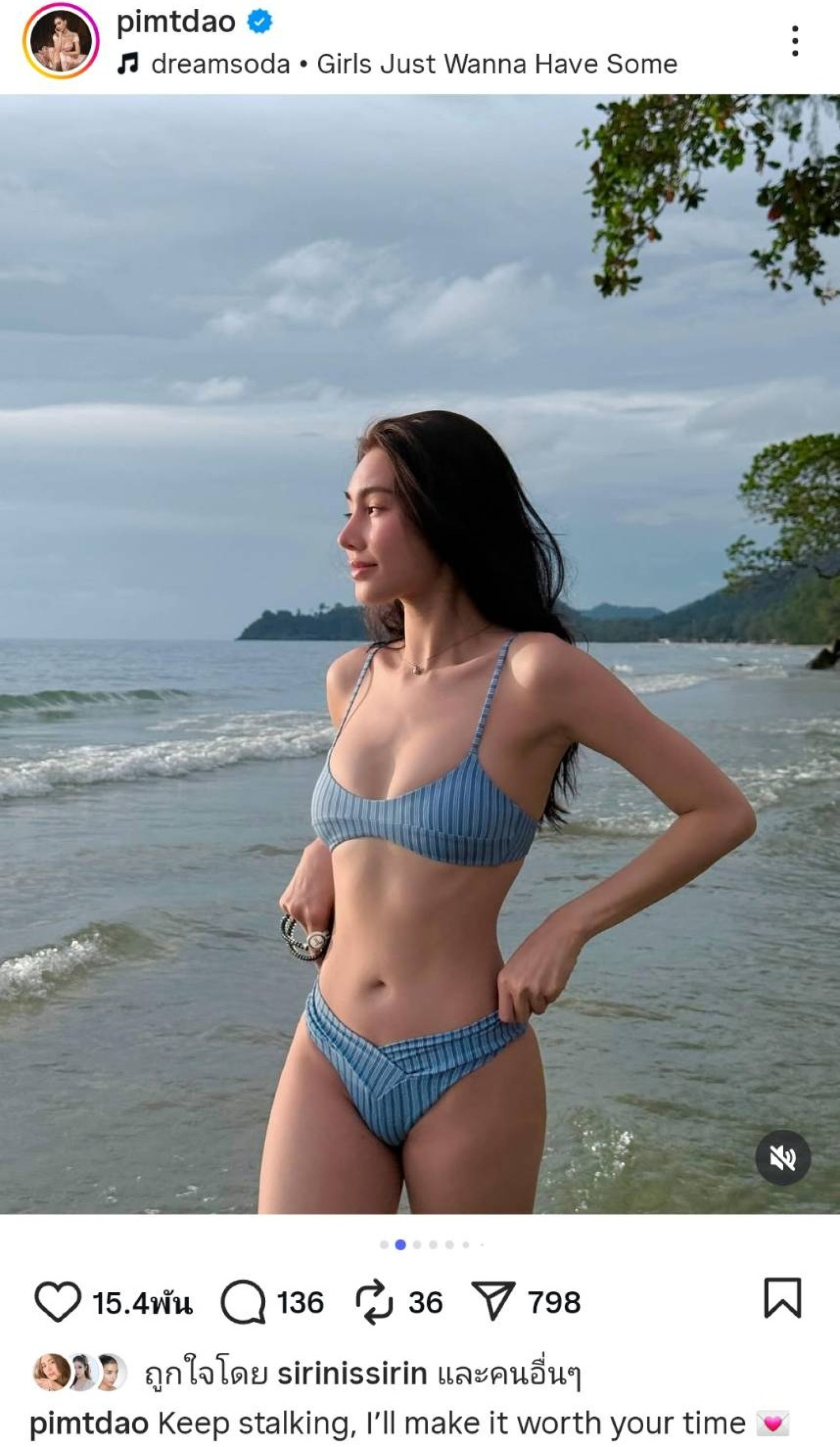 ทำเอาอินสตาแกรมร้อนแรงขึ้นมาทันที เมื่ออินฟลูเอนเซอร์สาวชื่อดัง "ดาว พิมพ์ทอง" (pimtdao) ปล่อยภาพทริปพักผ่อนริมทะเลในชุดบิกินีลายทางสีฟ้า-ขาว ที่เผยให้เห็นหุ่นสวย เอวเอส และผิวออร่า โชว์ความมั่นใจแบบเต็มร้อย