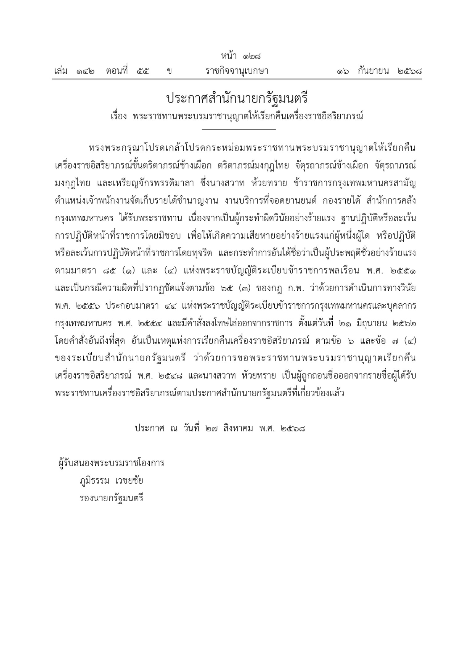 ทรงพระกรุณาโปรดเกล้าโปรดกระหม่อมพระราชทานพระบรมราชานุญาตให้เรียกคืนเครื่องราชอิสริยาภรณ์ชั้นตริตาภรณ์ช้างเผือก ตริตาภรณ์มงกุฎไทย จัตุรถาภรณ์ช้างเผือก จัตุรถาภรณ์มงกุฎไทย และเหรียญจักรพรรดิมาลา ซึ่งนางสวาท ห้วยทราย ข้าราชการกรุงเทพมหานครสามัญ ตำแหน่งเจ้าพนักงานจัดเก็บรายได้ชำนาญงาน งานบริการที่จอดยานยนต์ กองรายได้ สำนักการคลัง กรุงเทพมหานคร ได้รับพระราชทาน เนื่องจากเป็นผู้กระทำผิดวินัยอย่างร้ายแรง ฐานปฏิบัติหรือละเว้นการปฏิบัติหน้าที่ราชการโดยมิชอบ เพื่อให้เกิดความเสียหายอย่างร้ายแรงแก่ผู้หนึ่งผู้ใด หรือปฏิบัติหรือละเว้นการปฏิบัติหน้าที่ราชการโดยทุจริต และกระทำการอันได้ชื่อว่าเป็นผู้ประพฤติชั่วอย่างร้ายแรงตามมาตรา 85 (1) และ (4) แห่งพระราชบัญญัติระเบียบข้าราชการพลเรือน พ.ศ. 2551 และเป็นกรณีความผิดที่ปรากฏชัดแจ้งตามข้อ 65 (3) ของกฎ ก.พ. ว่าด้วยการดำเนินการทางวินัย พ.ศ. 2556 ประกอบมาตรา 44 แห่งพระราชบัญญัติระเบียบข้าราชการกรุงเทพมหานครและบุคลากรกรุงเทพมหานคร พ.ศ. 2554 และมีคำสั่งลงโทษไล่ออกจากราชการ ตั้งแต่วันที่ 21 มิถุนายน 2562 โดยคำสั่งอันถึงที่สุด อันเป็นเหตุแห่งการเรียกคืนเครื่องราชอิสริยาภรณ์ ตามข้อ 6 และข้อ 7 (4) ของระเบียบสำนักนายกรัฐมนตรี ว่าด้วยการขอพระราชทานพระบรมราชานุญาตเรียกคืนเครื่องราชอิสริยาภรณ์ พ.ศ. 2548 และนางสวาท ห้วยทราย เป็นผู้ถูกถอนชื่อออกจากรายชื่อผู้ได้รับพระราชทานเครื่องราชอิสริยาภรณ์ตามประกาศสำนักนายกรัฐมนตรีที่เกี่ยวข้องแล้ว