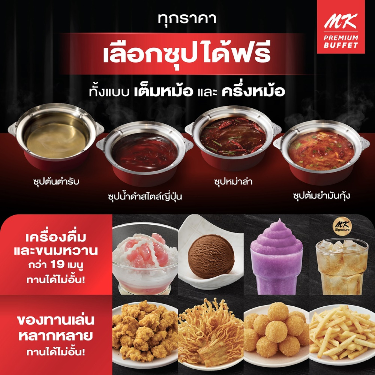 MK ต่อยอดสร้าง MK Premium Buffet “บุฟเฟต์สุกี้พรีเมียม” เมนูครบ คุณภาพระดับ MK โดดเด่นด้วยวาไรตี้ มาพร้อมทั้ง เป็ดย่าง หมูแดง หมูกรอบ ติ่มซำ เครื่องดื่ม ของหวาน พร้อมเมนูสุกี้คุณภาพและเมนูซิกเนเจอร์ของ MK กว่า130 เมนู ราคาเข้าถึงง่าย เริ่มต้น 499 บาท ไม่มีบวกเพิ่ม ตอบโจทย์ทั้งกลุ่มลูกค้าเดิมและกลุ่มใหม่ที่มองหาความคุ้มค่าพร้อมคุณภาพ ประกาศปรับรูปแบบบุฟเฟต์ใหม่รวม 8 สาขาทันทีแบบไม่ต้องรอ