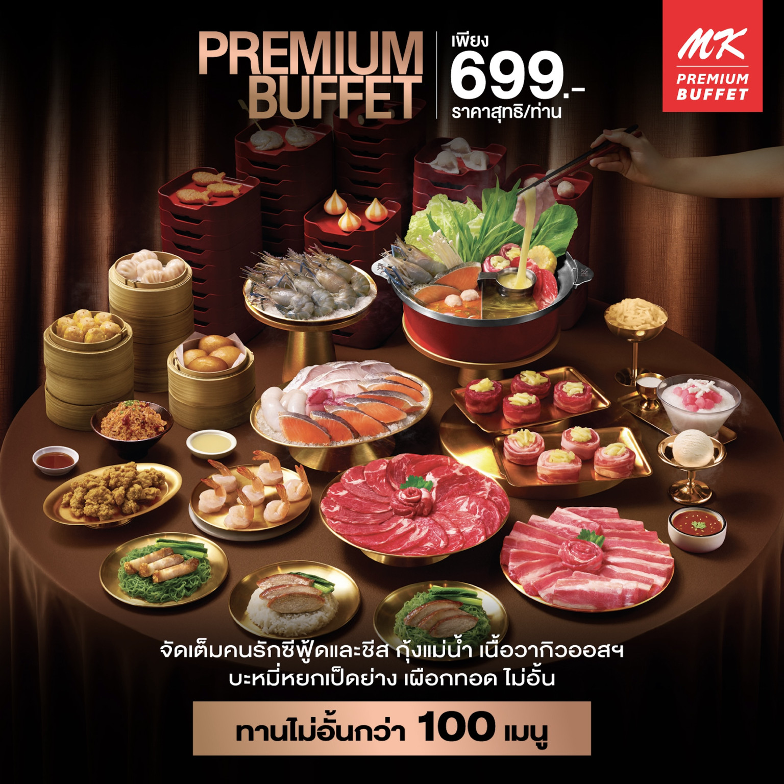 Premium Buffet 699 บาท บุฟเฟต์สุดพรีเมียม ถูกใจคนรัก บะหมี่หยกเป็ดย่าง ข้าวหน้าเป็ดย่างเอ็มเค เมนูสุกี้ พร้อมเสิรฟ เนื้อวากิวออสเตรเลีย หมูคุโรบุตะพรีเมียม พร้อมพาเหรดซีฟู้ด และชีสไม่อั้น ทั้งกุ้งแม่น้ำนำเข้า เนื้อนำเข้าห่อชีส ติ่มซำทอดสุดฮิต