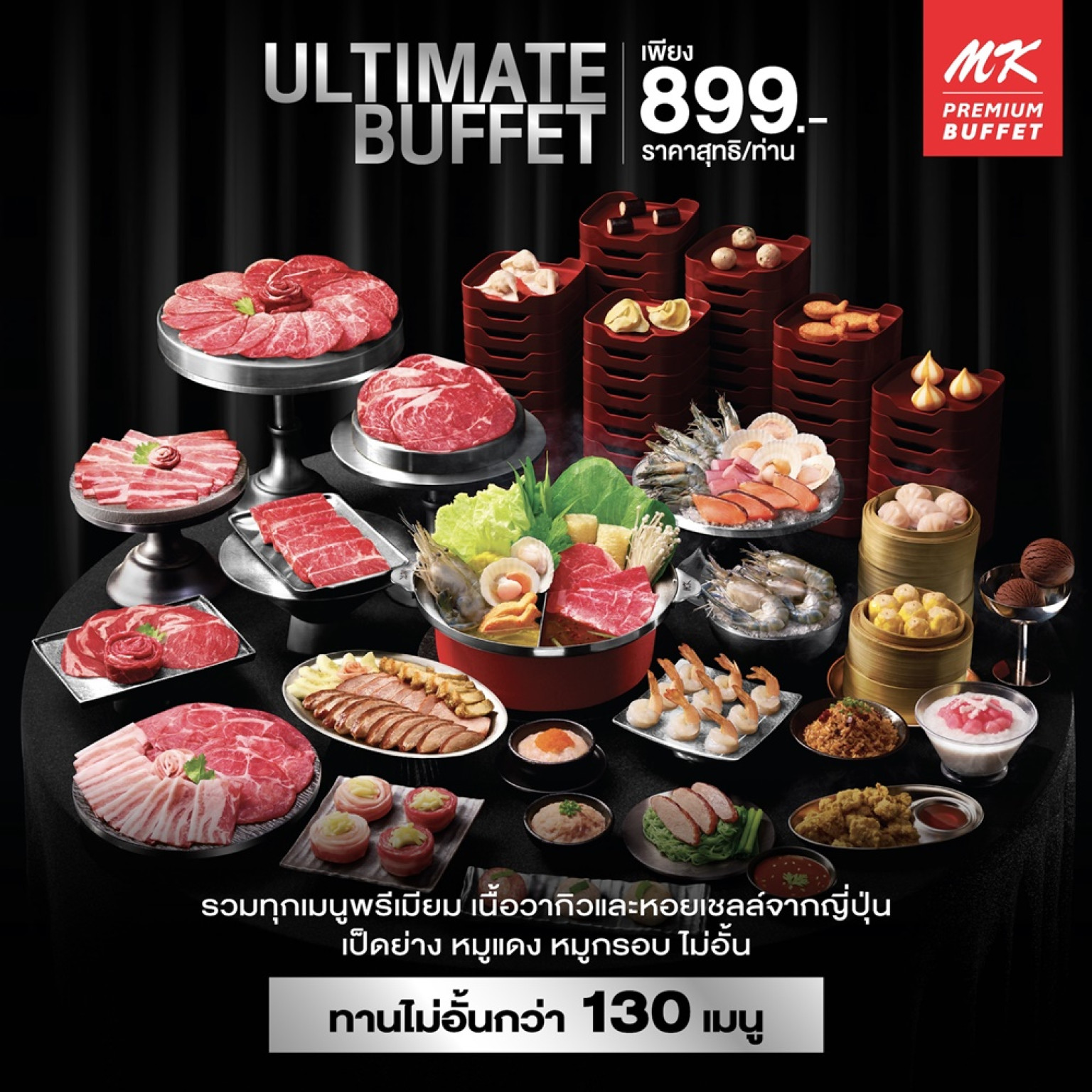 Ultimate Buffet 899 บาท ที่สุดของความพรีเมียมแบบอัพเลเวล ตามเสียงเรียกร้องของชาวโซเชียล ด้วยเป็ดย่าง MK จานเดี่ยวที่สั่งได้ไม่อั้น และยังมีหมูแดง หมูกรอบ เนื้อวากิวญี่ปุ่น ซีฟู้ดนำเข้าคุณภาพ และติ่มซำพรีเมียม พร้อมเมนู อื่น ๆ อีกเพียบ ซึ่งราคารวมค่าเครื่องดื่มและขนมหวานแล้ว ไม่มีบวกเพิ่ม