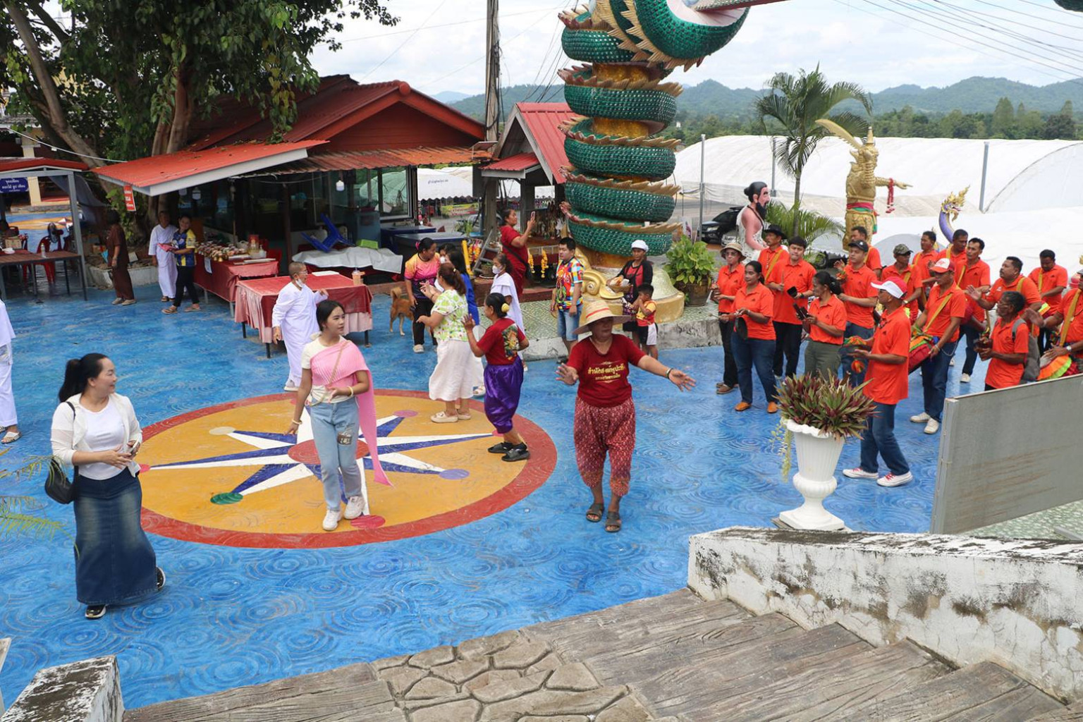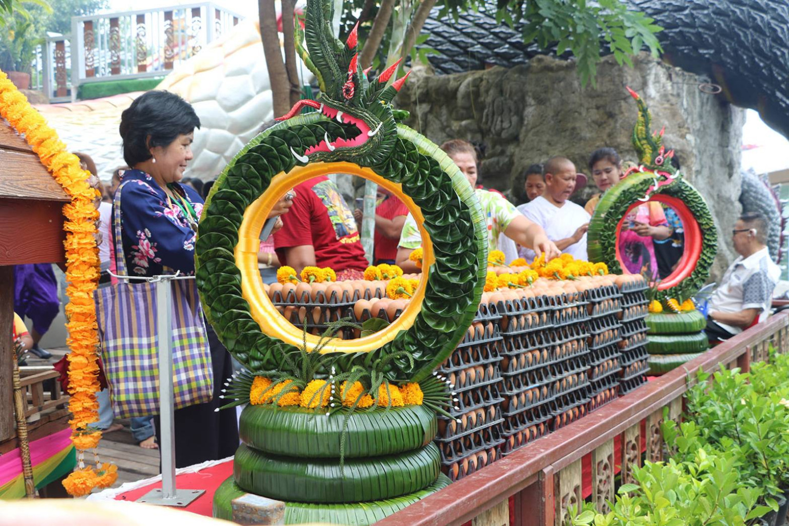 ชาวบ้านจ้างวงกลองยาวรำแก้บน พร้อมนำไข่ไก่ร้อยแผงถวายบ่วงนาคบาศยักษ์ ที่สำนักสงฆ์พุปะหัง วงค์วนาราม หลังหวยถูกกันถ้วนหน้า
