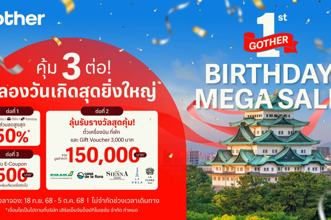Gother (โกเธอร์) แพลตฟอร์มจองทริปท่องเที่ยวของคนไทยเพื่อคนไทย ฉลองครบรอบ 1 ปี จัดโปรโมชั่นสุดยิ่งใหญ่ อัดโปรแรงสุดในรอบปี รับส่วนลดและรางวัลกว่า 3 ต่อ ให้ทั้งส่วนลด ตั๋วเครื่อง ที่พัก กิจกรรม พร้อมสิทธิ์ลุ้นรางวัลใหญ่ ทั้งตั๋วเครื่องบิน EVA ไป-กลับญี่ปุ่นและที่พัก 5 ดาว รวมมูลค่ากว่า 150,000 บาท และโค้ดส่วนลดเพิ่ม 500 บาท ระหว่าง 18 ก.ย.–5 ต.ค.นี้เท่านั้น หวังส่งเสริมคนไทยเที่ยวช่วงสิ้นปีถึงต้นปี 2569