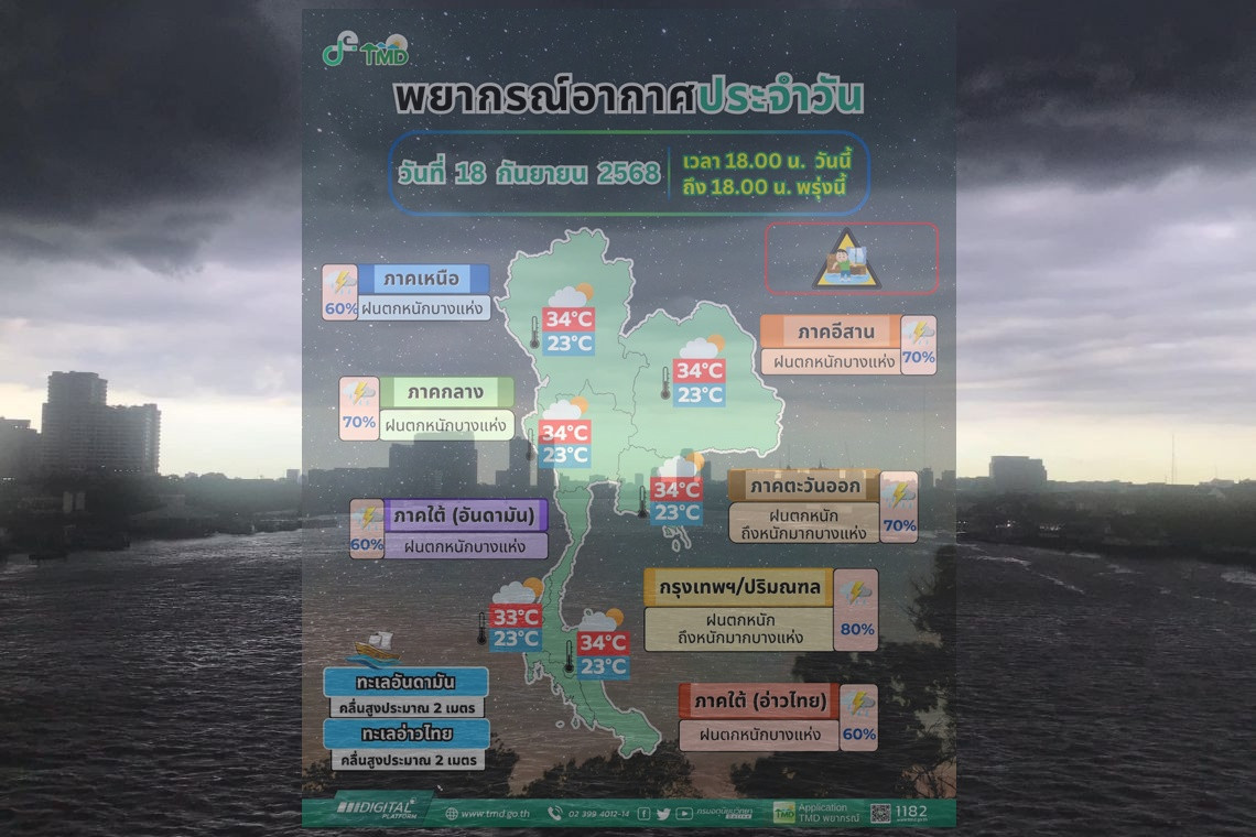 กรมอุตุนิยมวิทยาเผยพยากรณ์อากาศประจำวันที่ 18 กันยายน 2568 ตั้งแต่เวลา 18.00 น. วันนี้ ถึง 18.00 น. วันพรุ่งนี้ โดยหลายพื้นที่ของประเทศยังคงมีฝนตกหนักถึงหนักมาก