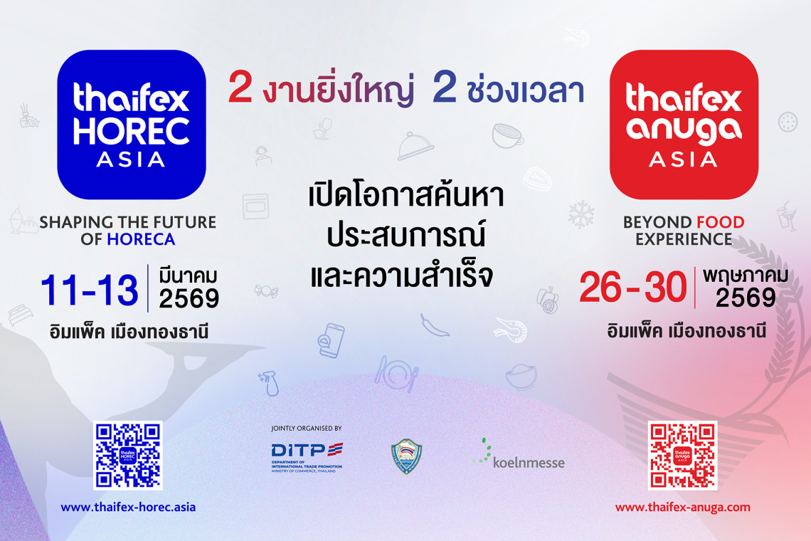 ด้าน “THAIFEX – ANUGA ASIA 2026” งานแสดงสินค้าอาหารและเครื่องดื่มที่ใหญ่และครบวงจรที่สุดแห่งเอเชีย กำหนดจัดขึ้นระหว่างวันที่ 26–30 พฤษภาคม 2569 ณ อิมแพ็ค เมืองทองธานี โดยครั้งนี้จะขยายพื้นที่การจัดงานให้ยิ่งใหญ่กว่าเดิม เพื่อรองรับจำนวนผู้ประกอบการและผู้ชมงานที่เพิ่มขึ้นอย่างต่อเนื่อง พร้อมตอกย้ำการเป็นเวทีการค้าที่สำคัญระดับโลก