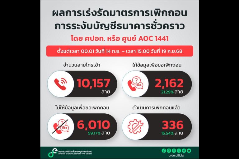 ศูนย์ปฏิบัติการเพื่อป้องกันและปราบปรามอาชญากรรมทางเทคโนโลยี (ศปอท.) หรือ ศูนย์ AOC 1441 เปิดเผยรายงานผลการเร่งรัดมาตรการเพิกถอนการระงับบัญชีธนาคารชั่วคราว ระหว่างวันที่ 14 กันยายน เวลา 00.01 น. – 19 กันยายน 2568 เวลา 15.00 น.