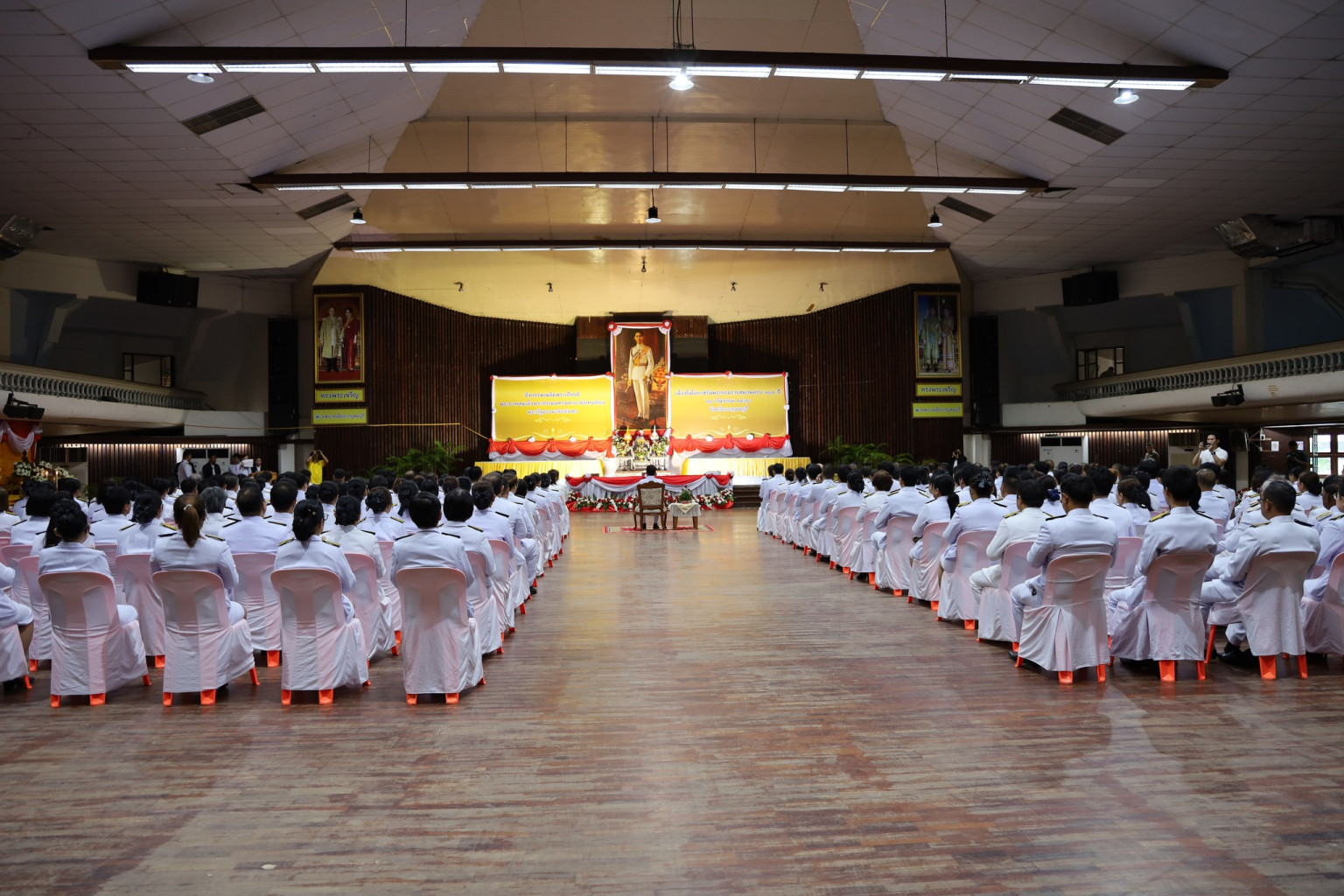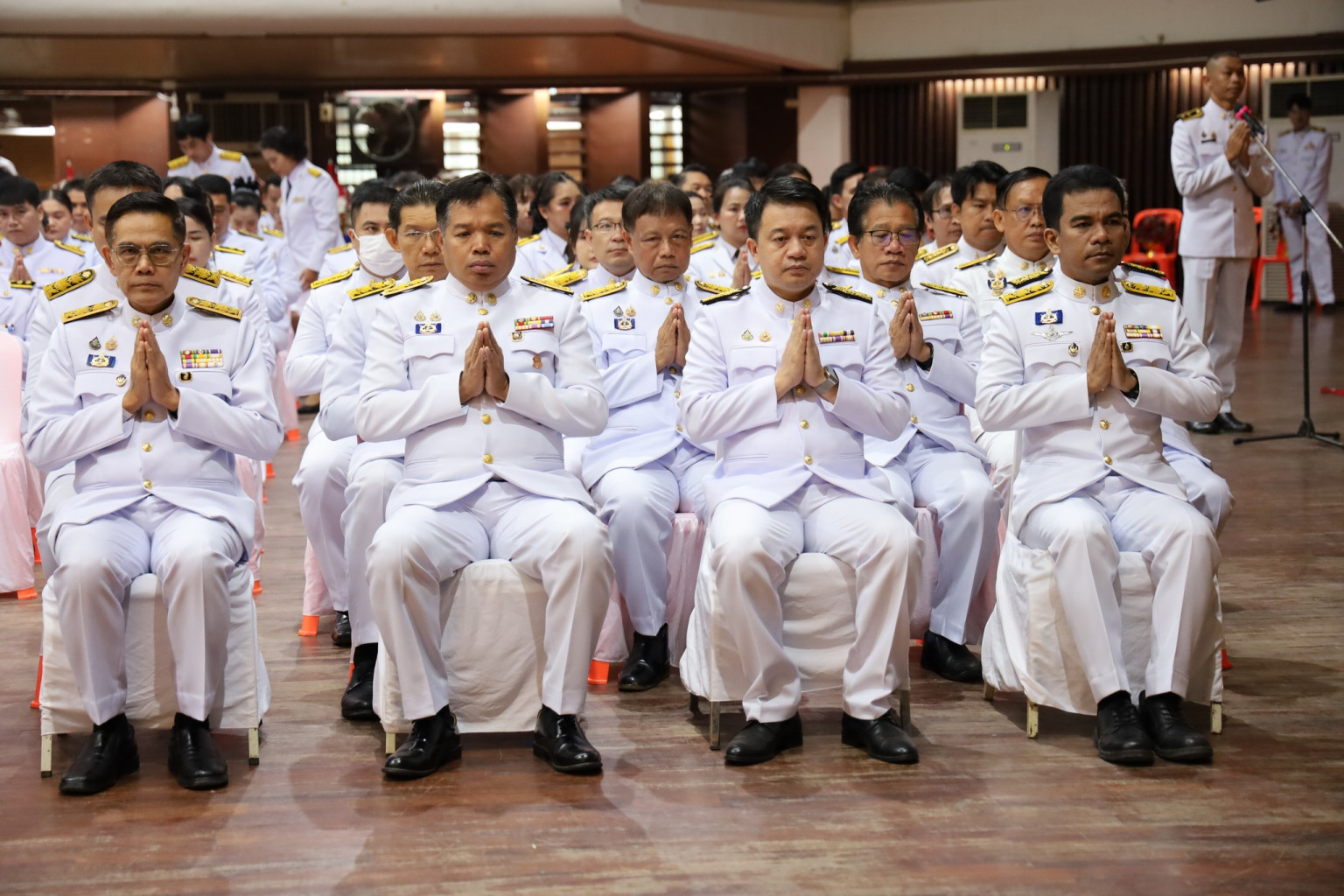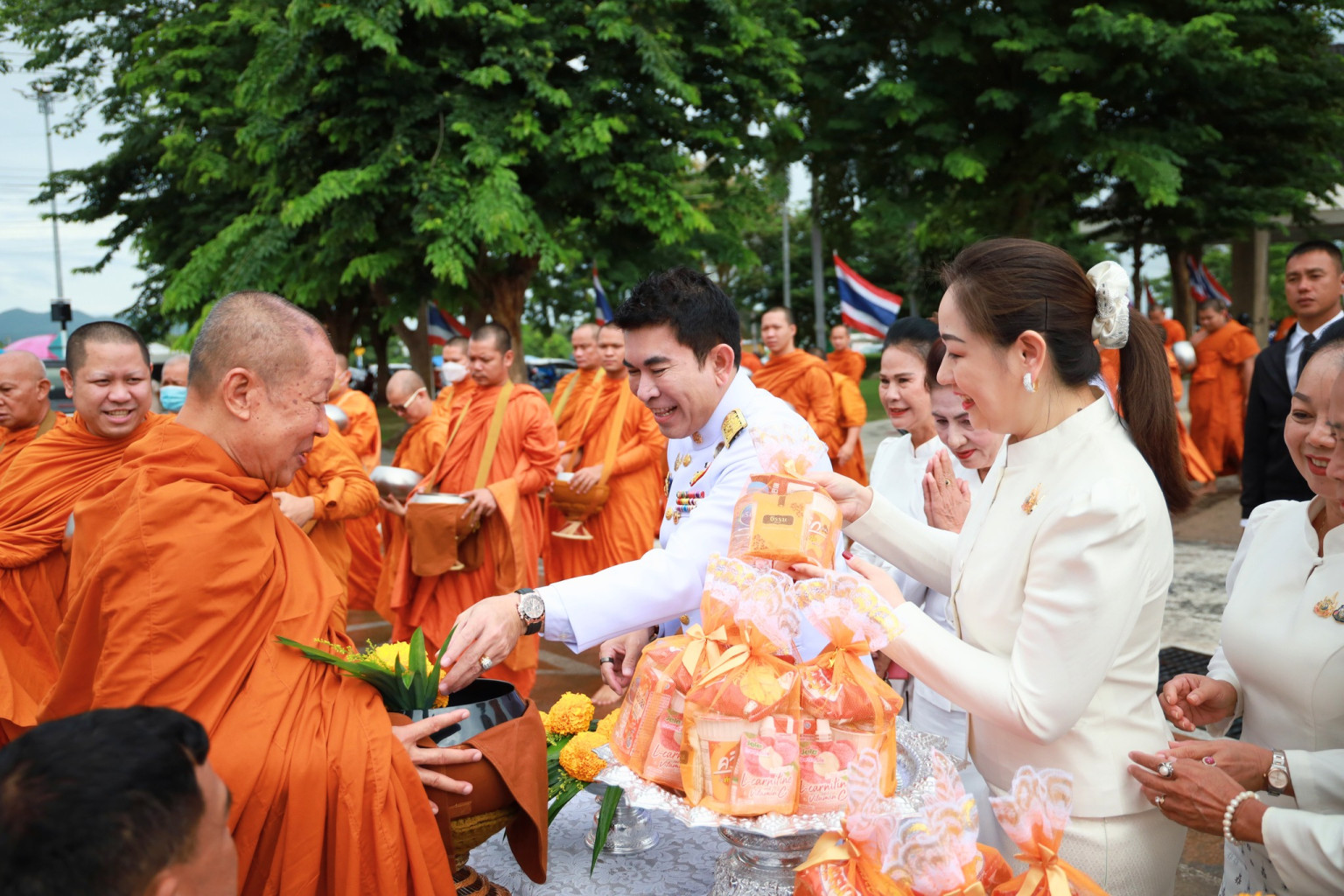 ภายในพิธีประกอบด้วย การเจริญพระพุทธมนต์ ทำบุญตักบาตรถวายพระราชกุศล และวางพานพุ่มดอกไม้ถวายราชสักการะ โดยมีนางสาวกิตติยา จึงรุ่งเจริญกิจ นายกเหล่ากาชาดและประธานแม่บ้านมหาดไทยจังหวัดกาญจนบุรี ว่าที่ร้อยตรี ศุภมงคล บูชาถ่ายเทศ นายวุฒิพงษ์ สุภัควนิช นางพรรณวิภา ปิยัมปุตระ นายสิทธิวีร์ วรรณพฤกษ์ รองผู้ว่าราชการจังหวัดกาญจนบุรี พร้อมด้วยหัวหน้าส่วนราชการ ข้าราชการ ศาล ทหาร ตำรวจ หน่วยงานรัฐวิสาหกิจ เจ้าหน้าที่ และพสกนิกรชาวกาญจนบุรีเข้าร่วมพิธีอย่างพร้อมเพรียง โดยมีพระสงฆ์และสามเณรจำนวน 100 รูป ร่วมรับบิณฑบาต